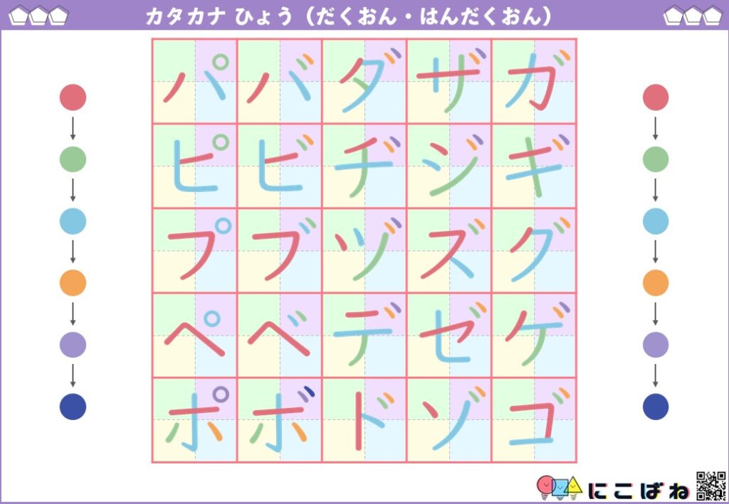 カタカナ表(濁音・半濁音×色つきマス)のプリントはこちら