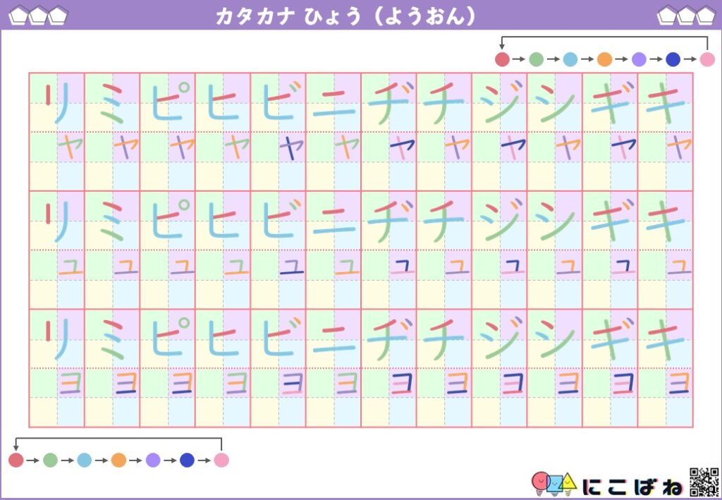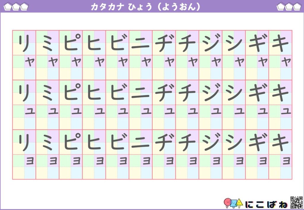 - 清音と拗音のカタカナを色つきマスで整理し、「ャ・ュ・ョ」の位置関係を直感的につかめる構成