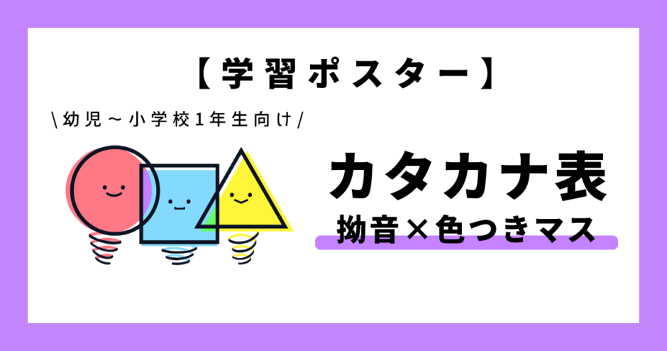 - 清音と拗音のカタカナを色つきマスで整理した、拗音の並びを視覚的に理解できる学習ポスターです。