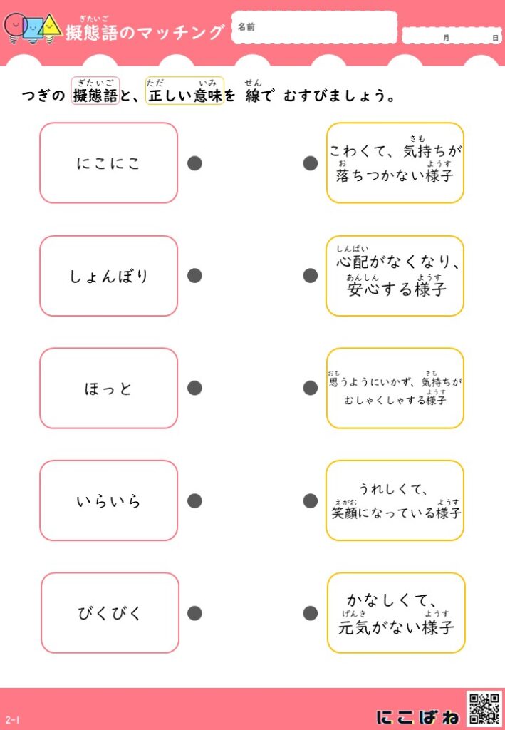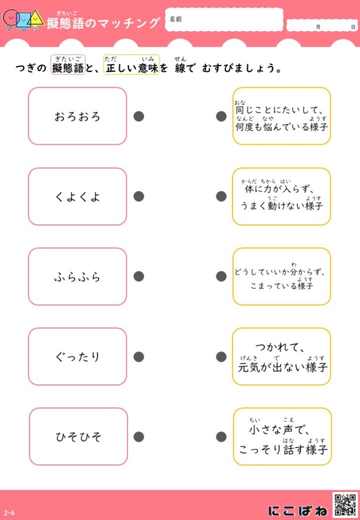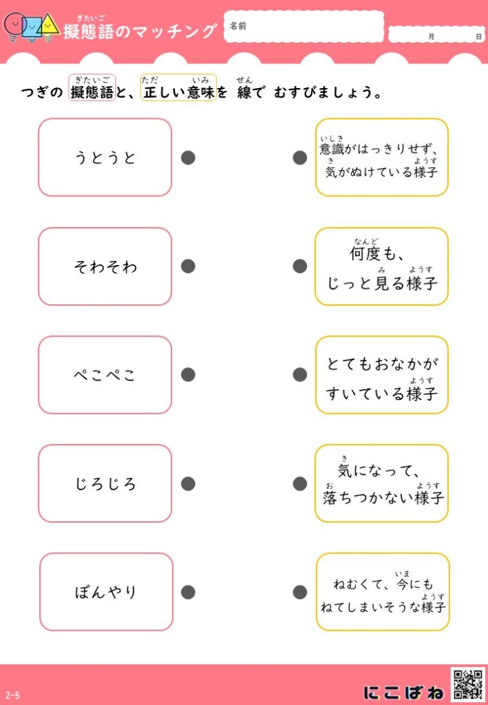 このプリントでは、そうした擬態語を短く分かりやすい意味文と組み合わせ、線でむすぶ形式で確認できる構成にしています。