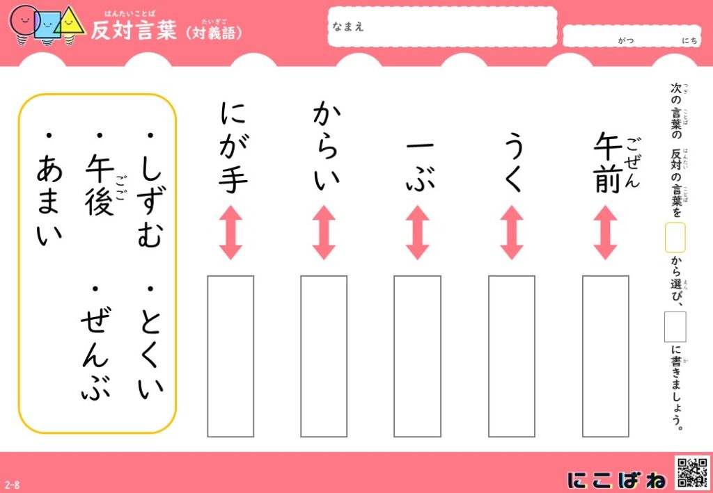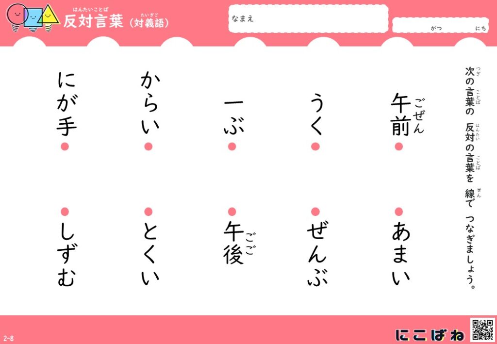 このプリントでは、お子さまの習得度合いに応じて、「点つなぎ → 選択 → 記述」とステップアップできる構成にしました。言葉の関係について、見たり選んだりしながら、自然と「反対の意味とは何か」に気づいていけるよう工夫しています。