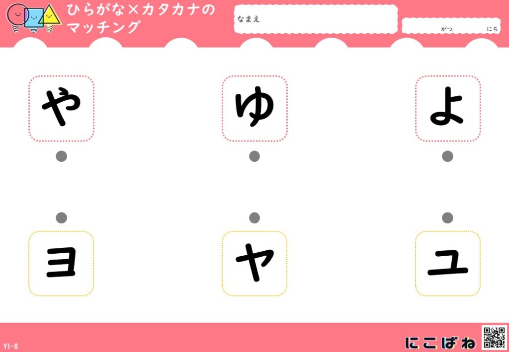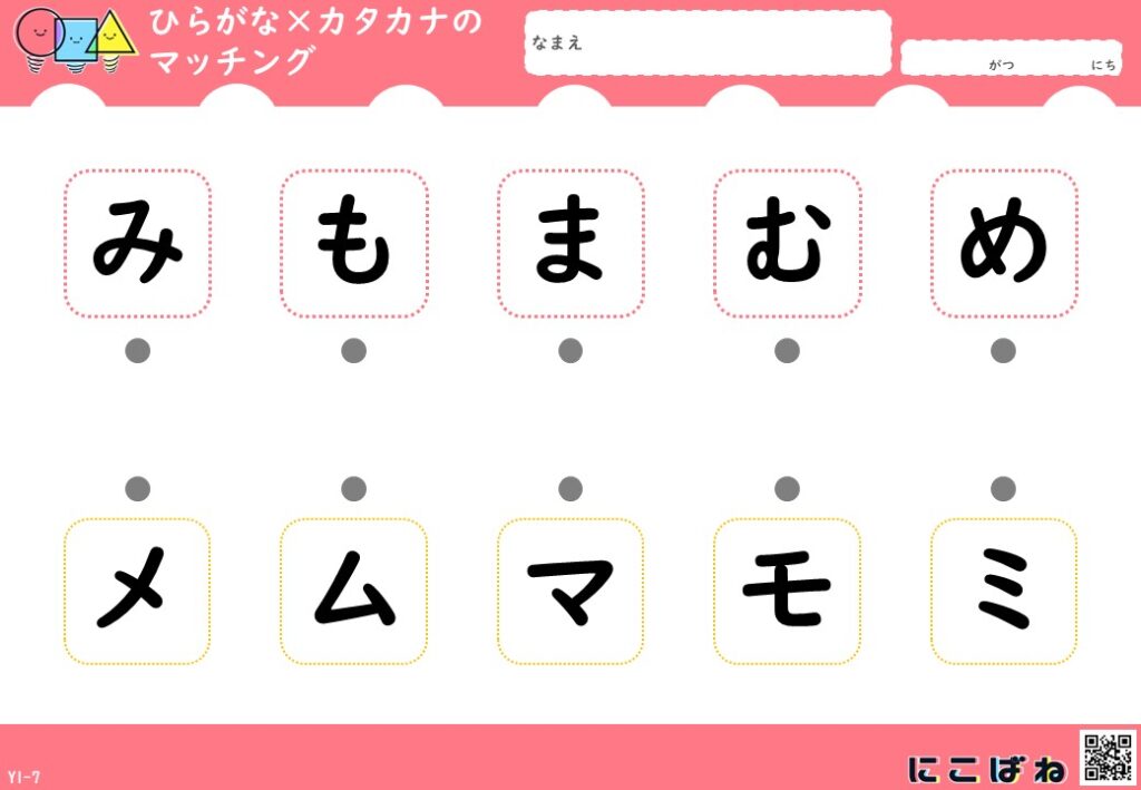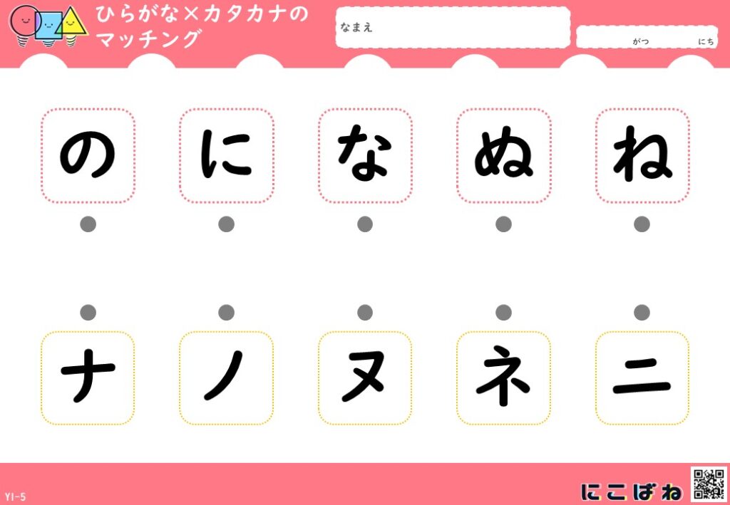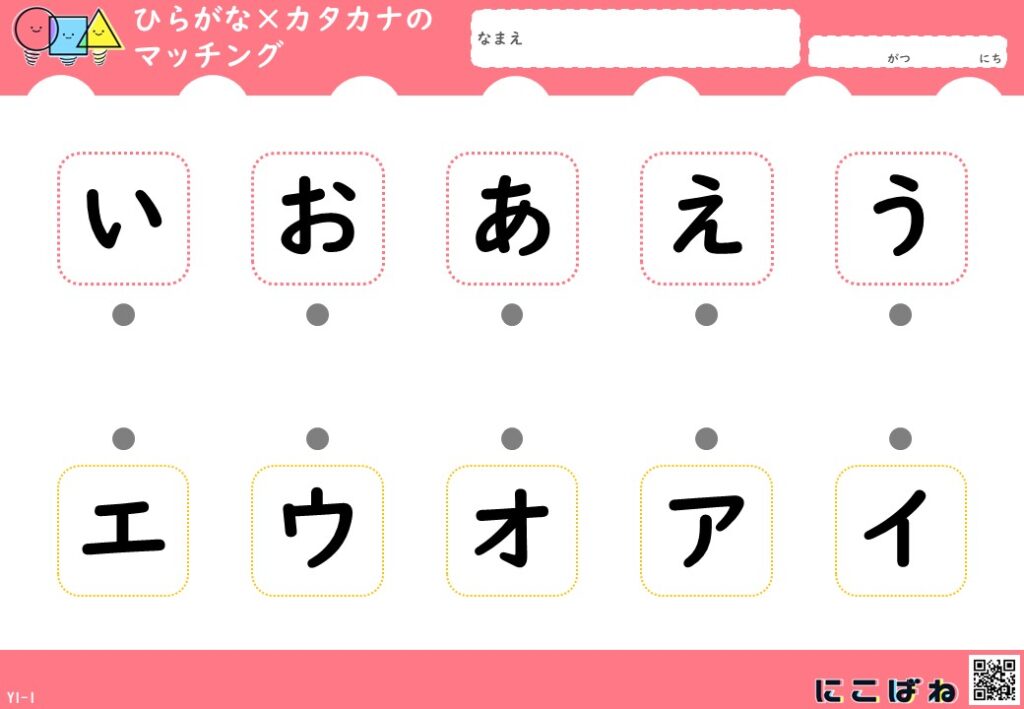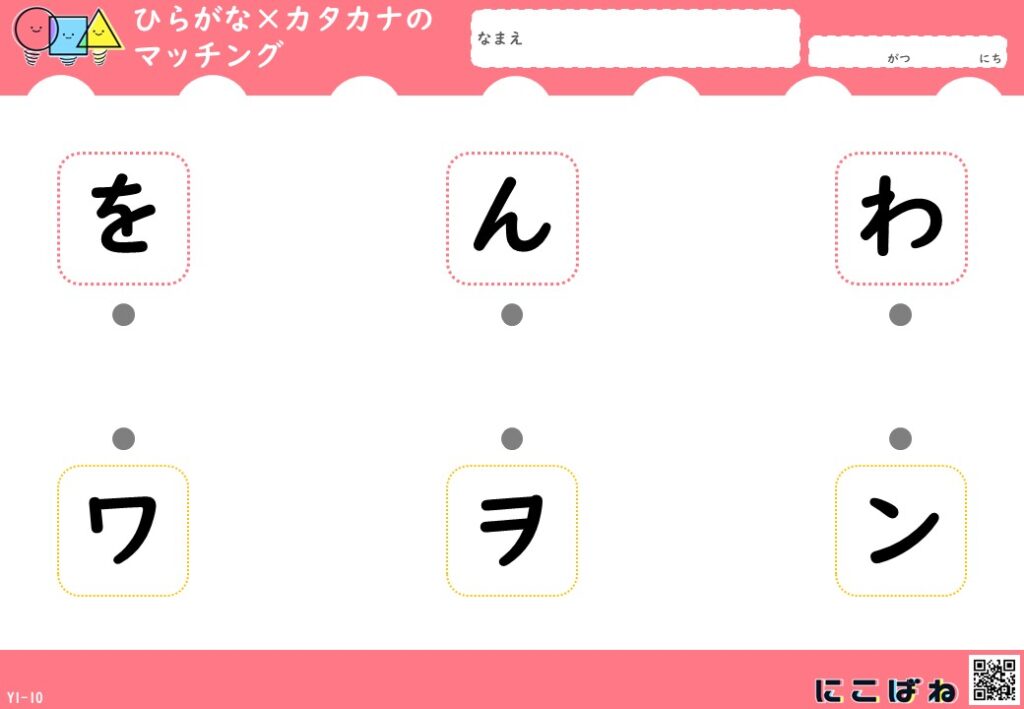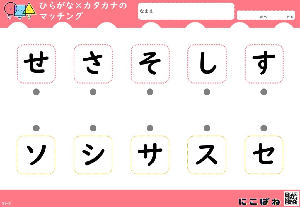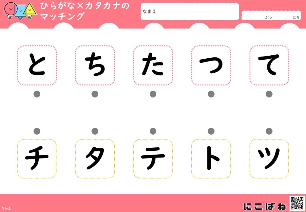 - ひらがなとカタカナの対応関係を、点つなぎで楽しく確認できるプリント