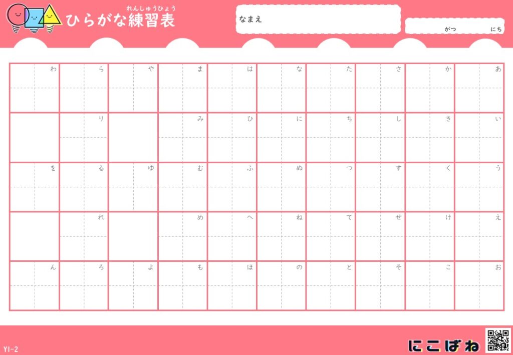 色つきマスのひらがな練習表もご用意しています。視覚的に位置感覚をつかみたい方はこちらもおすすめです。