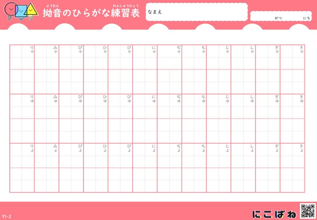 こちらは、拗音を書いて身につけることに重点を置いたひらがな練習表です。