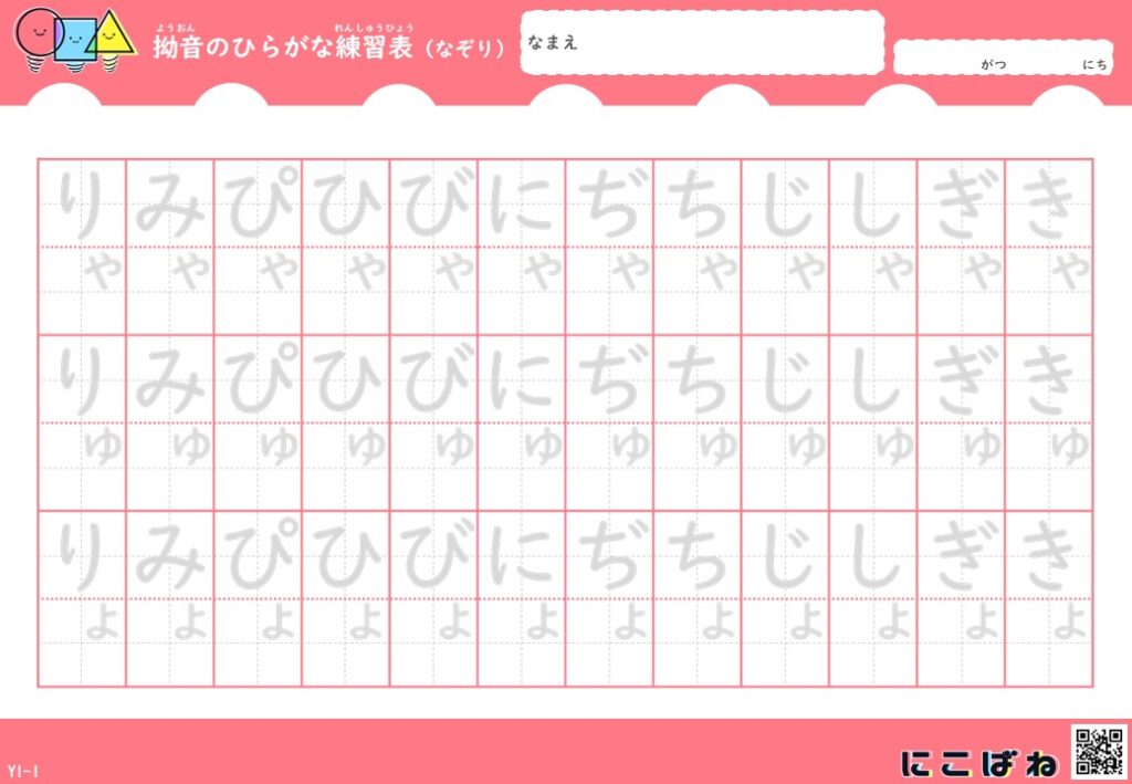 - ひらがなの系列を一覧で見渡しながら書くことで、拗音のパターンを整理しながら定着させる視点をサポートします。