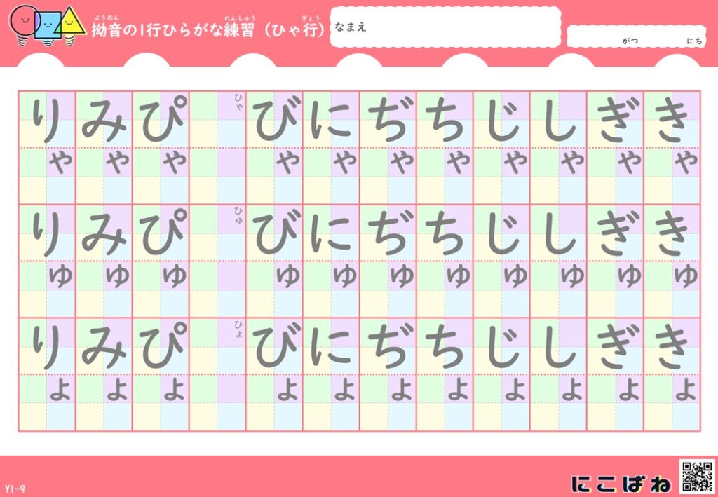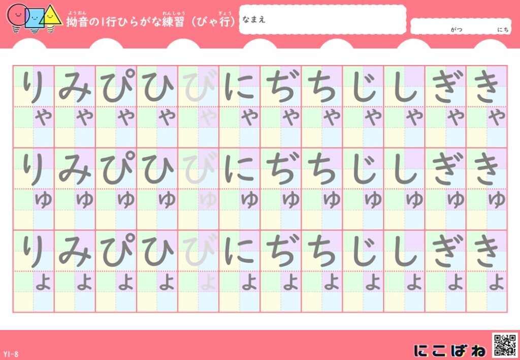 拗音のひらがなを1行ずつ練習したあとは、表でまとめて確認することで、音のまとまりや並びをよりしっかり整理できます。