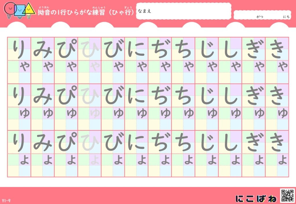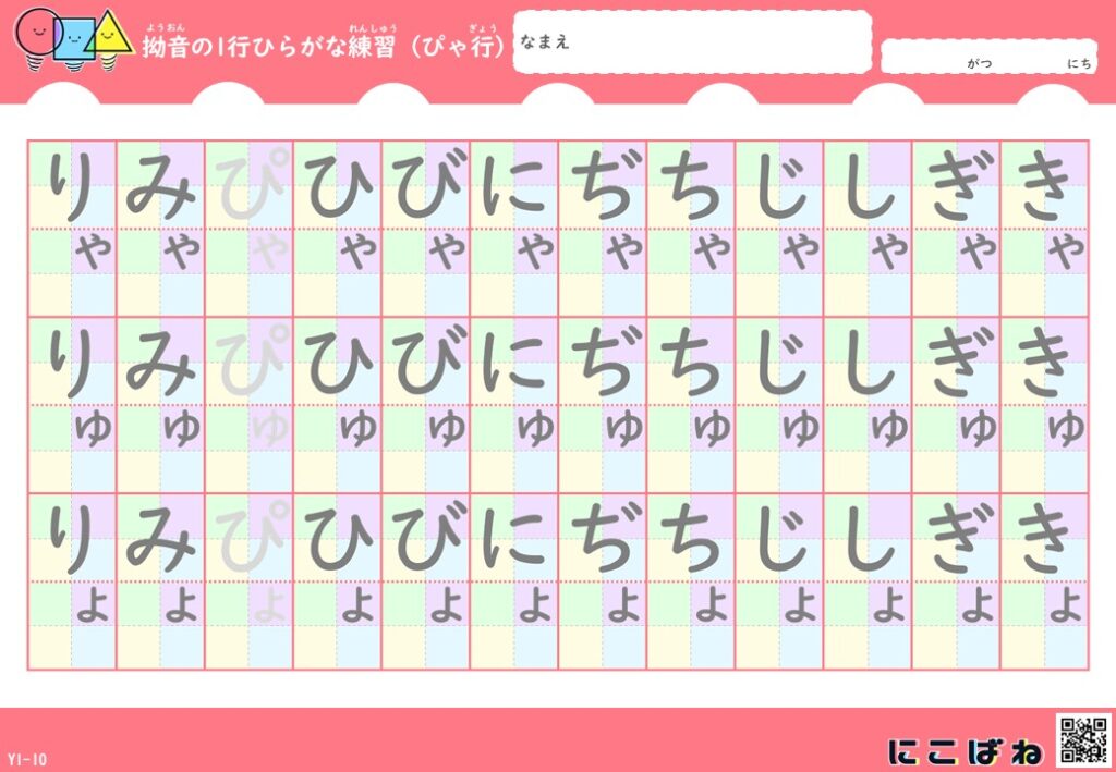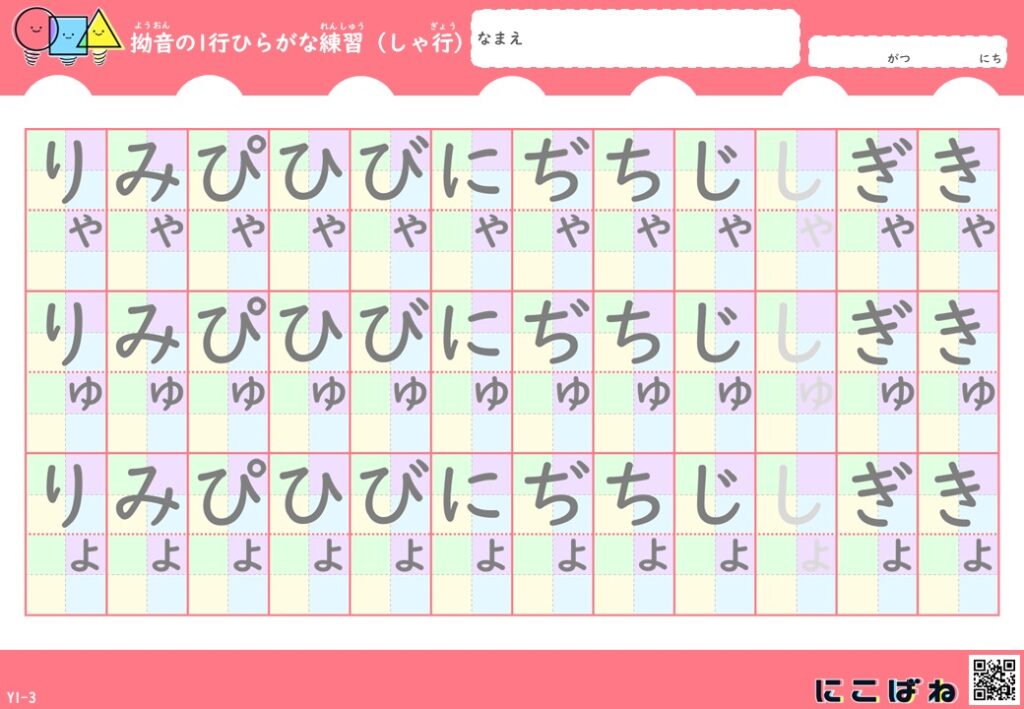 こちらは、拗音のひらがなを1行で分かりやすく身につけられる「1行ひらがな練習(拗音×色つきマス)」プリントです。
