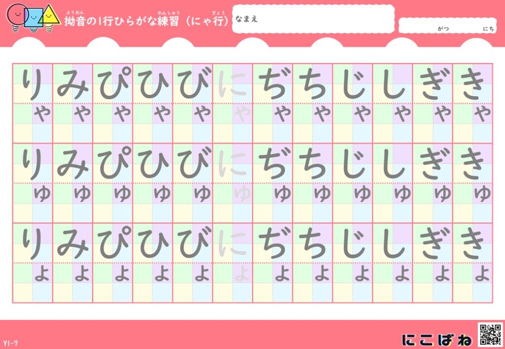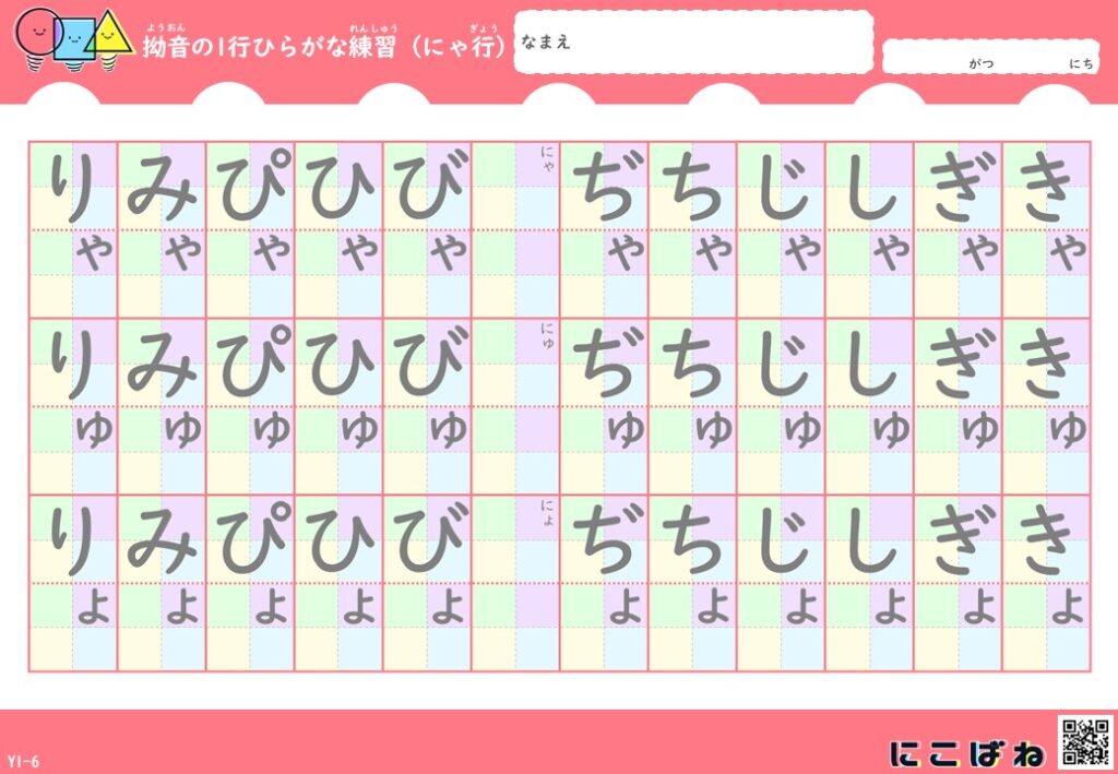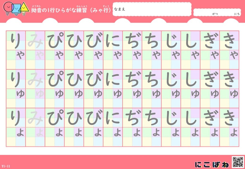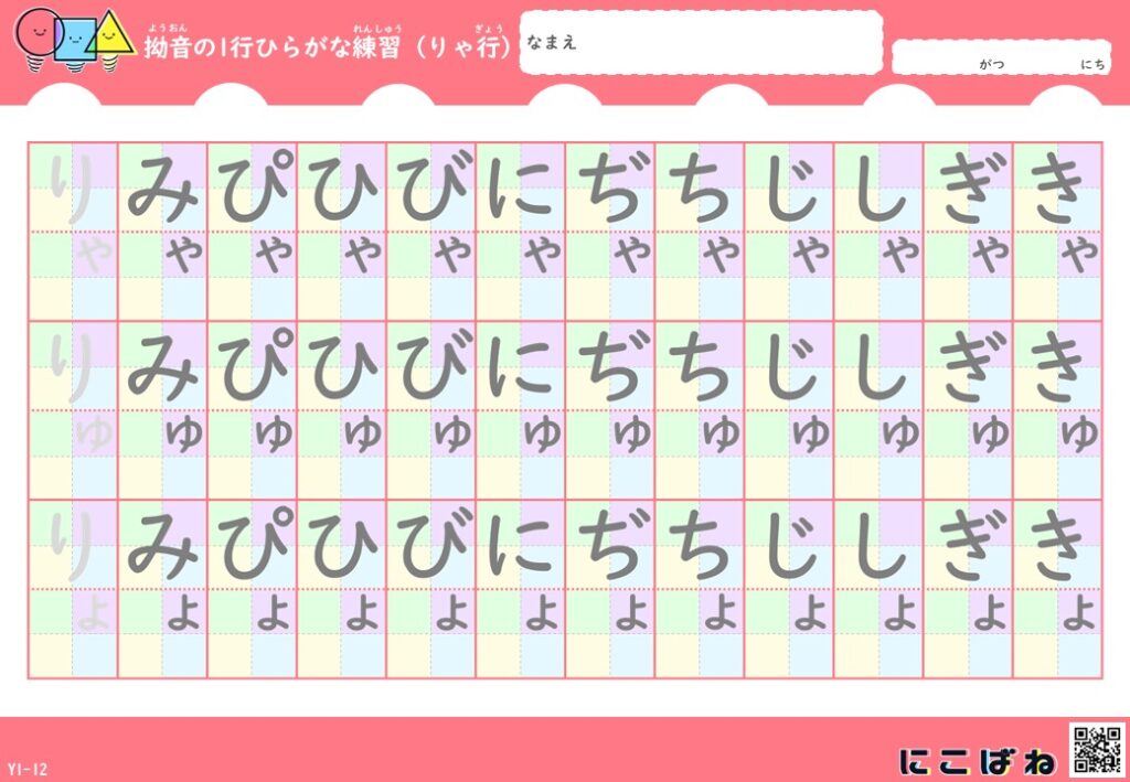 拗音の1行ひらがな練習(色つきマス×なぞり)プリントはこちら