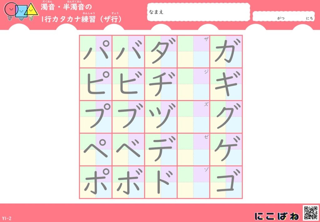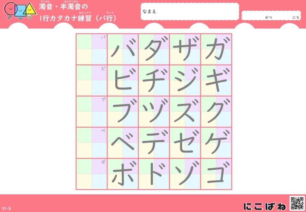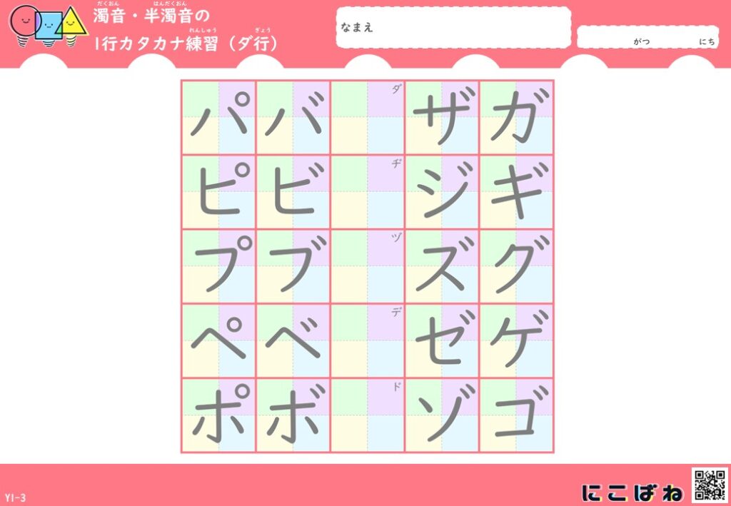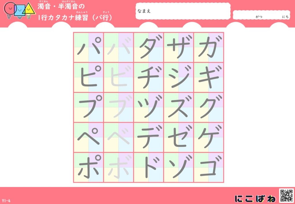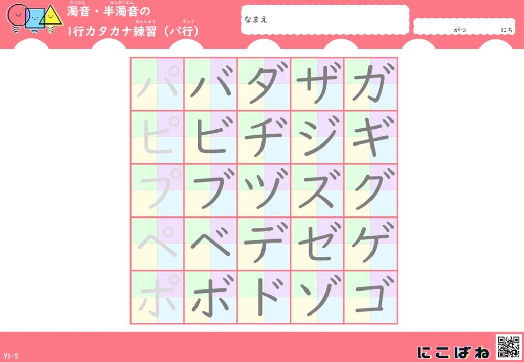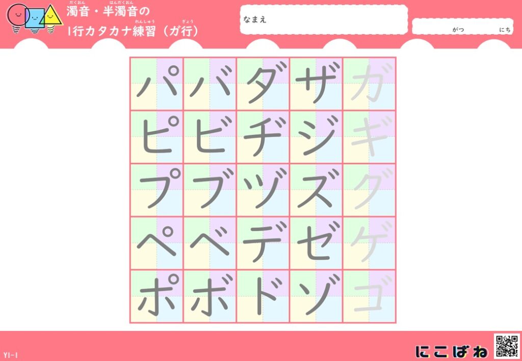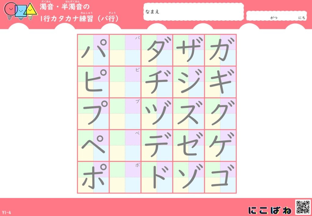 濁音・半濁音の1行カタカナ練習(色つきマス×なぞり)プリントはこちら