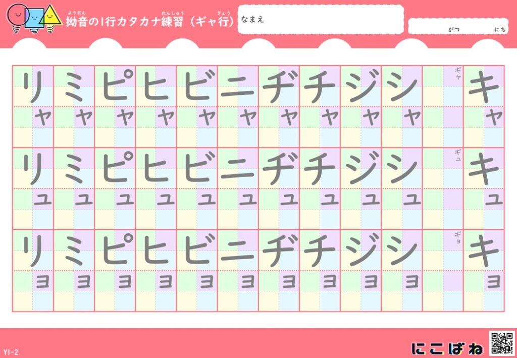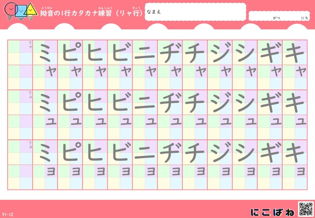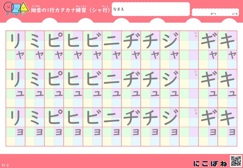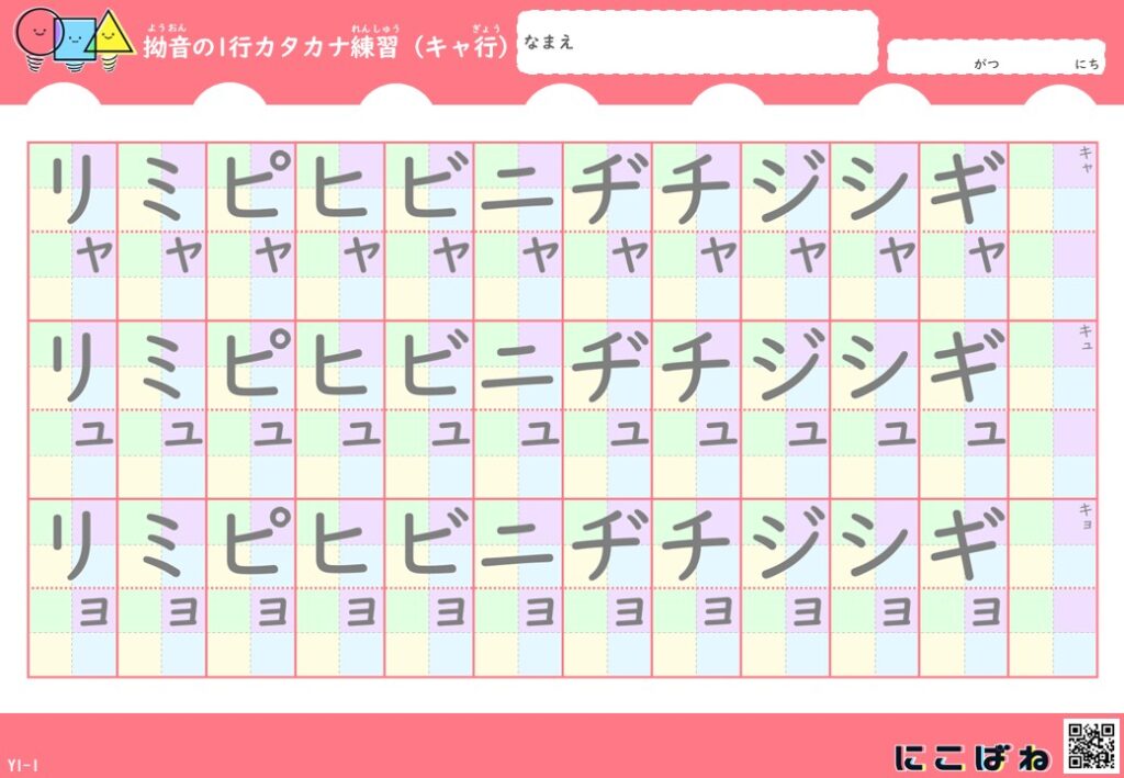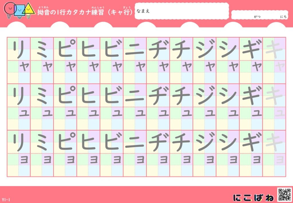 拗音の1行カタカナ練習(色つきマス×なぞり)プリントはこちら