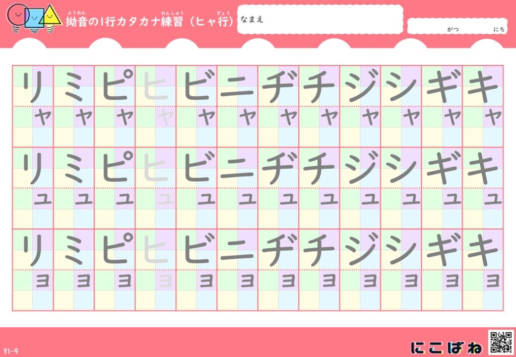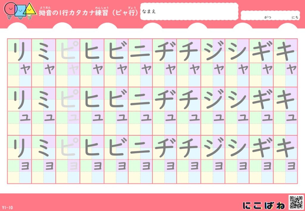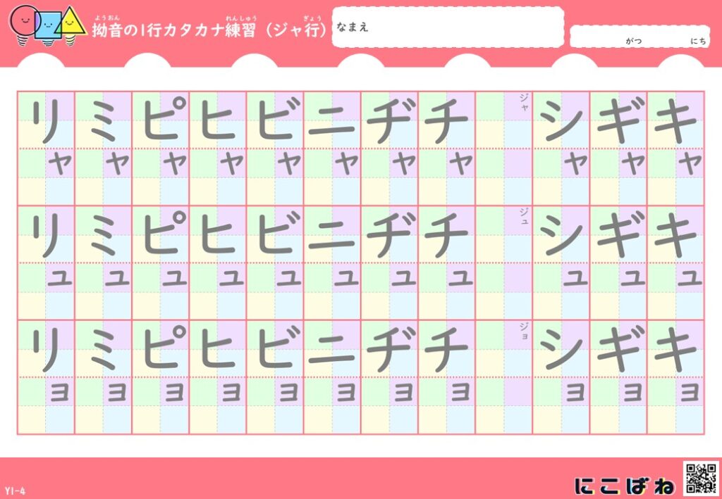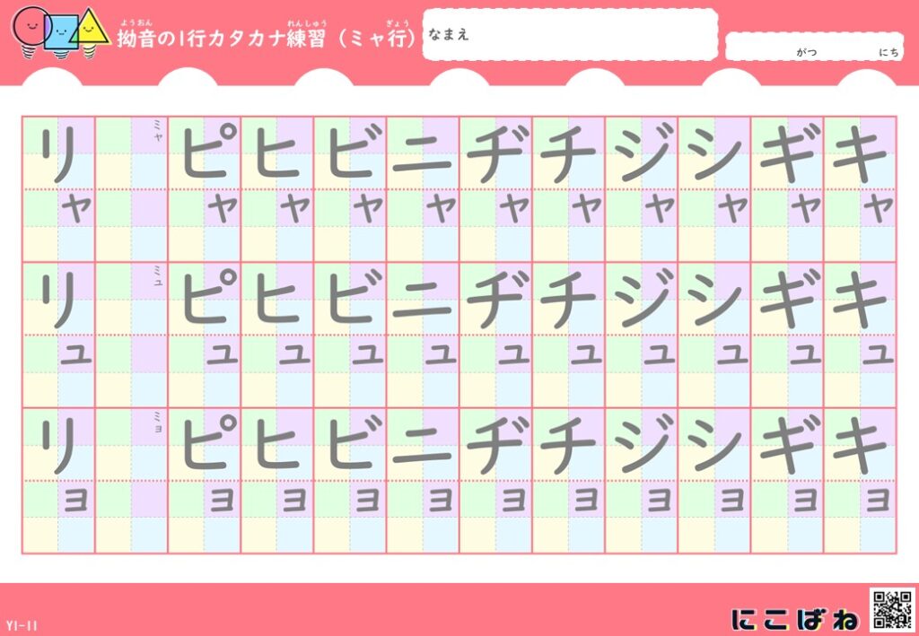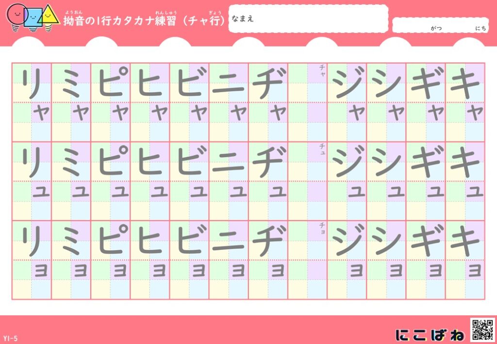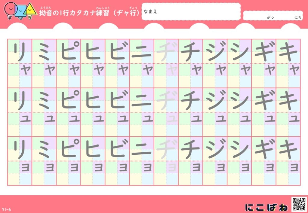 拗音の1行カタカナ練習(色つきマス×なぞり)プリントはこちら