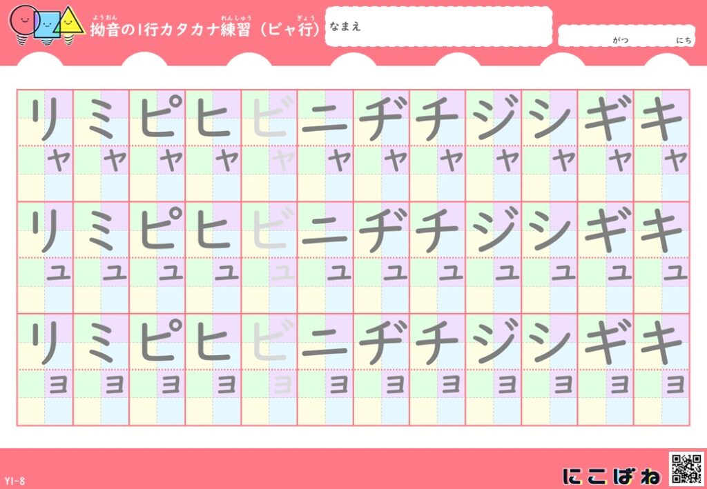 拗音のカタカナを1行ずつ練習したあとは、表でまとめて確認することで、音のまとまりや並びをよりしっかり整理できます。