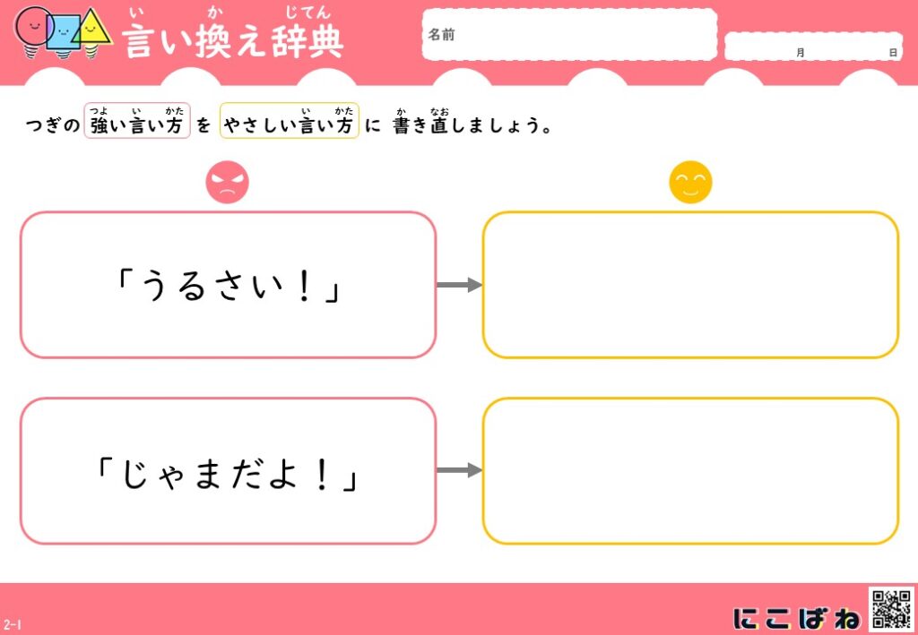 - 「言い方を変える」「言葉をやさしくする」など、コミュニケーション力やことばの使い方を意識するきっかけになる学習プリントです。