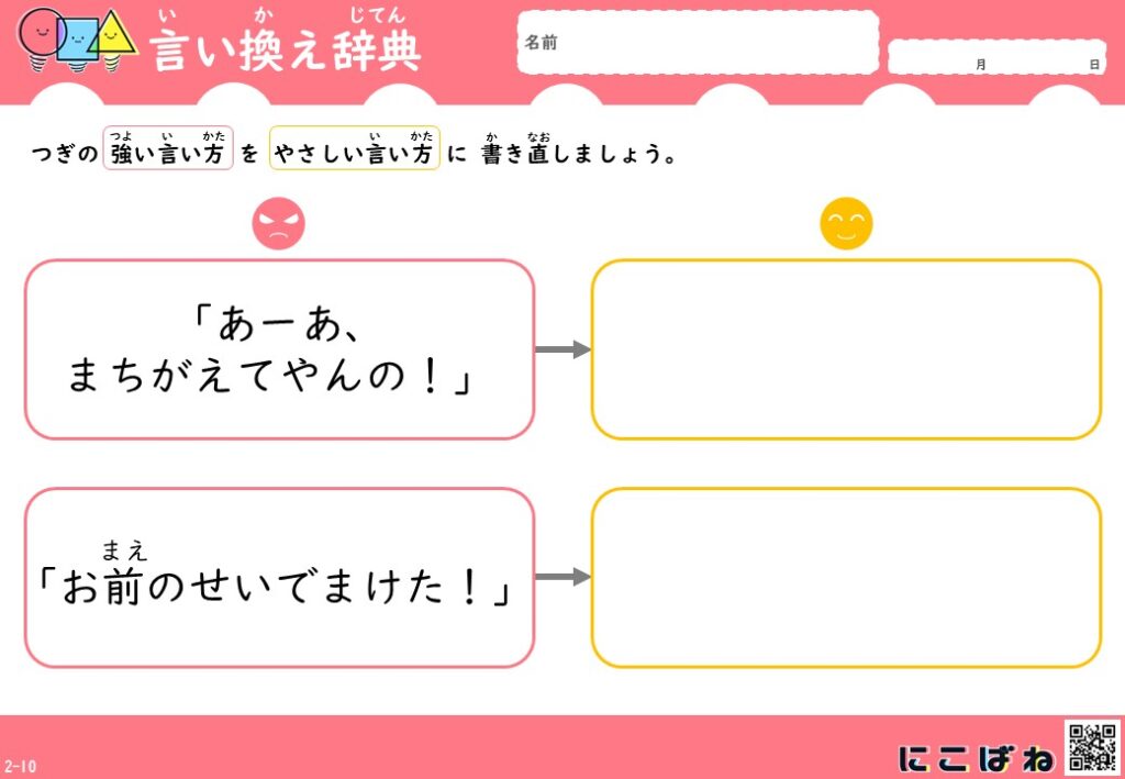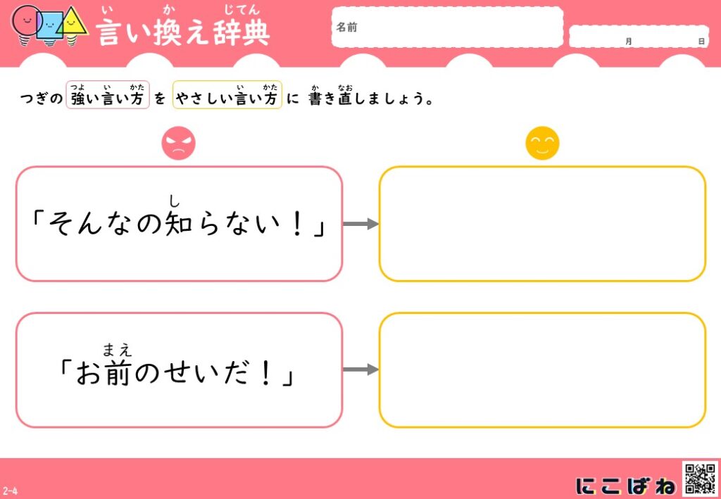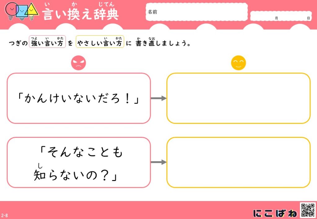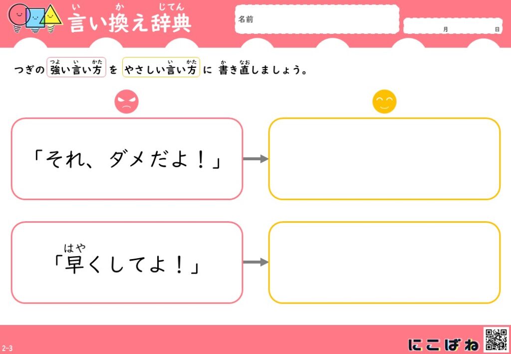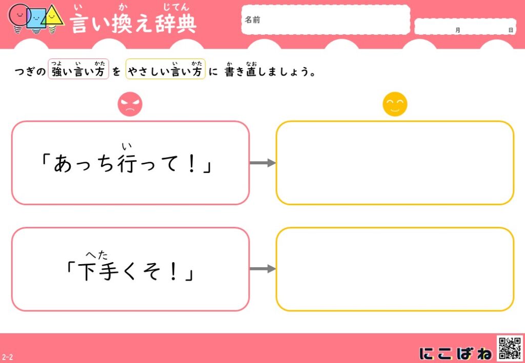 今回のプリントは、、「どんな言い方をするとよいか」を考える練習として作成しています。