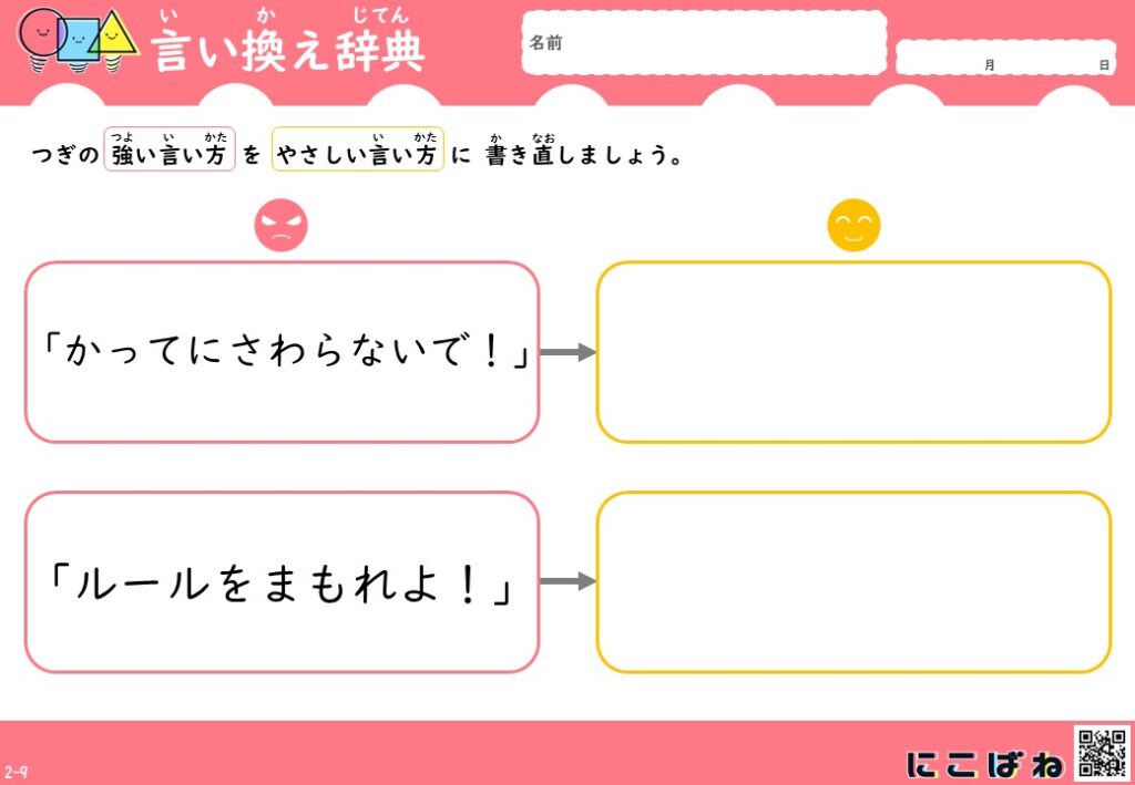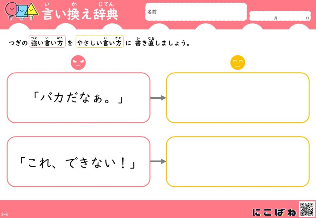 - 強い言い方をそのまま使うのではなく、相手の気持ちを考えたやさしい言い方を選ぶ力を育てることをねらいとしています。