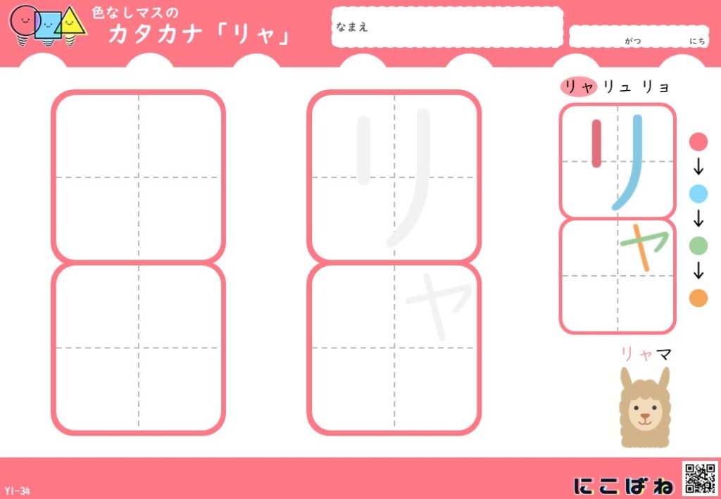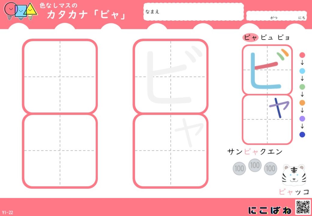 - 拗音(キャ・シュ・チョなど)の全カタカナを、白いマスに書き込んで練習できるプリントです。