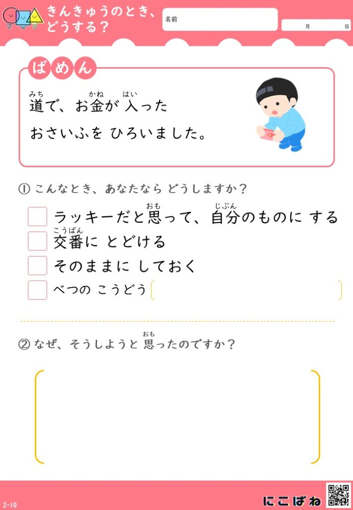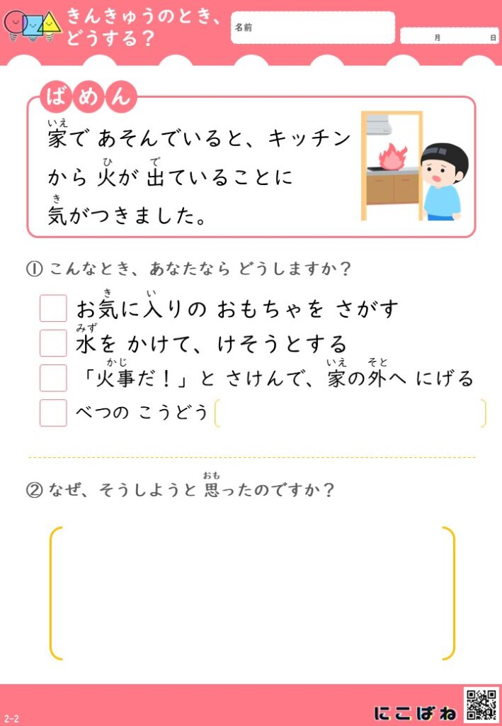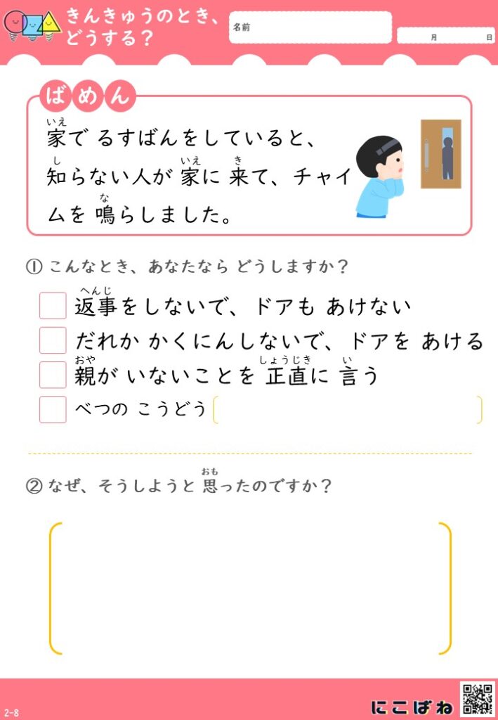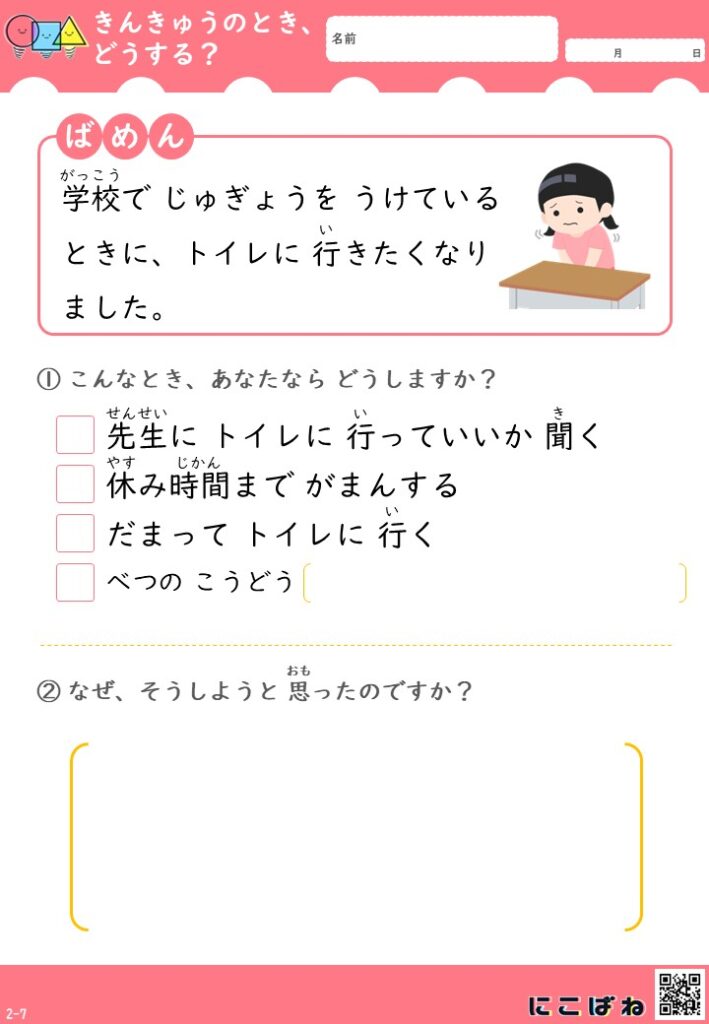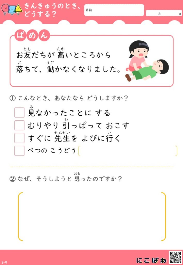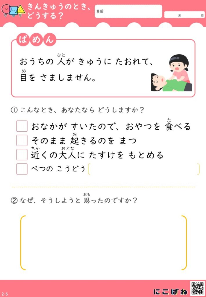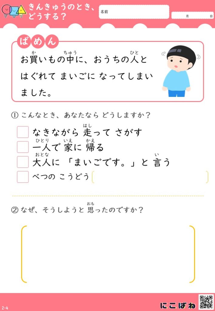 こちらは、「こんなときどうする?」をテーマにした緊急時対応プリントです。
