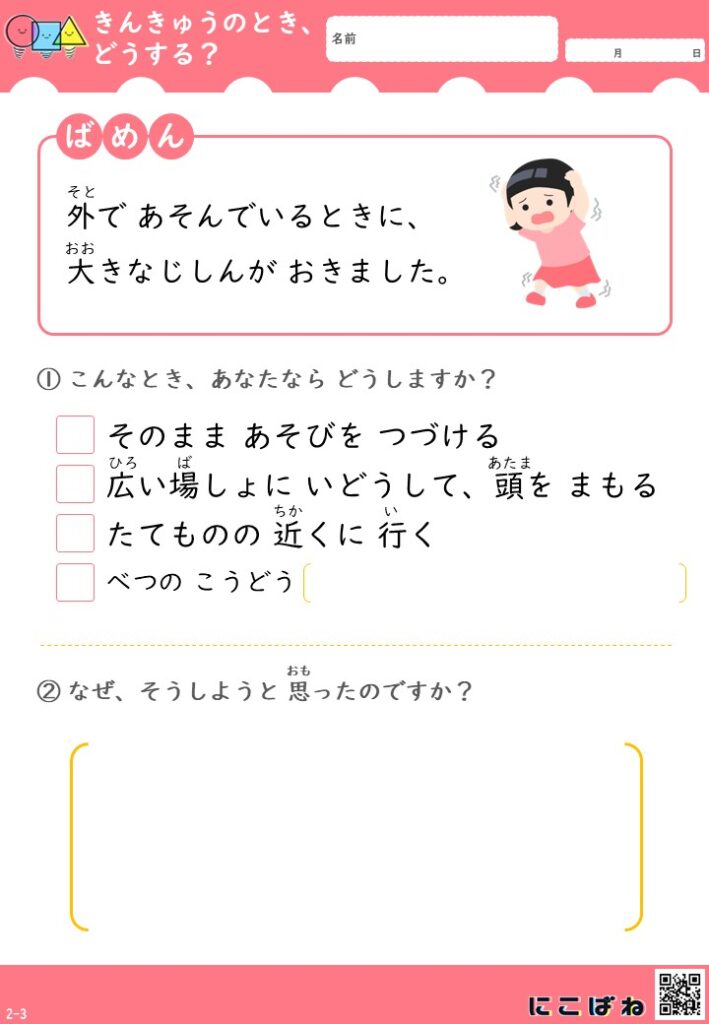 - 家庭・学校・放課後等デイサービスなどで、防災教育や安全指導に活用しやすい実践型プリントです。