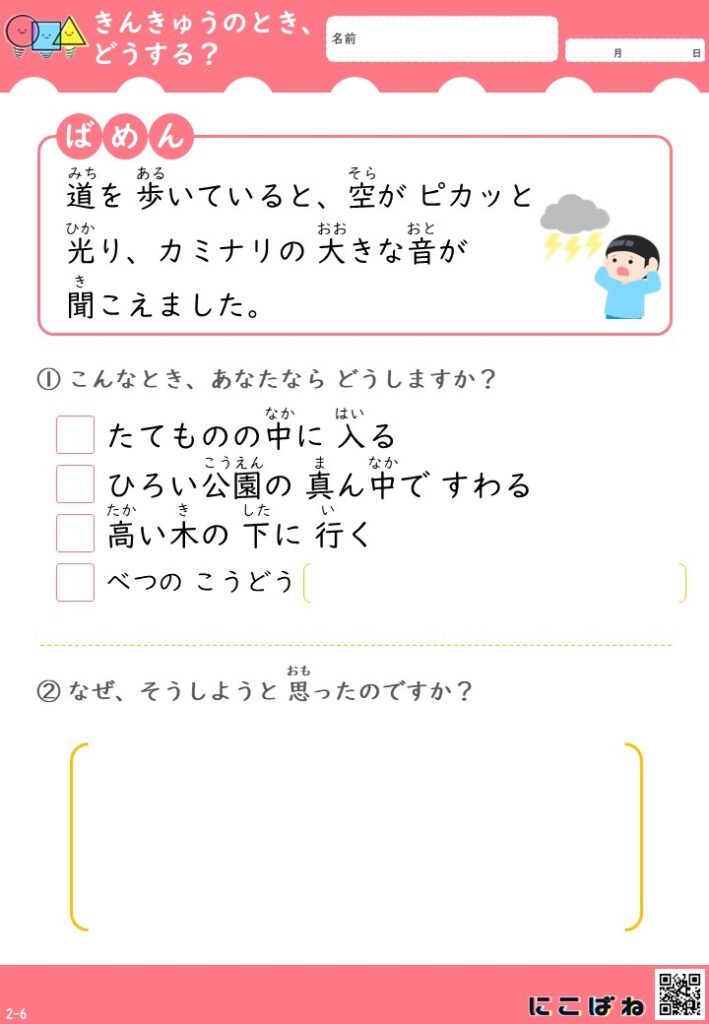 - 地震や雷、不審者など身近な危険場面を想定し、正しい行動を考えながら安全な対応力を身につけられるプリント