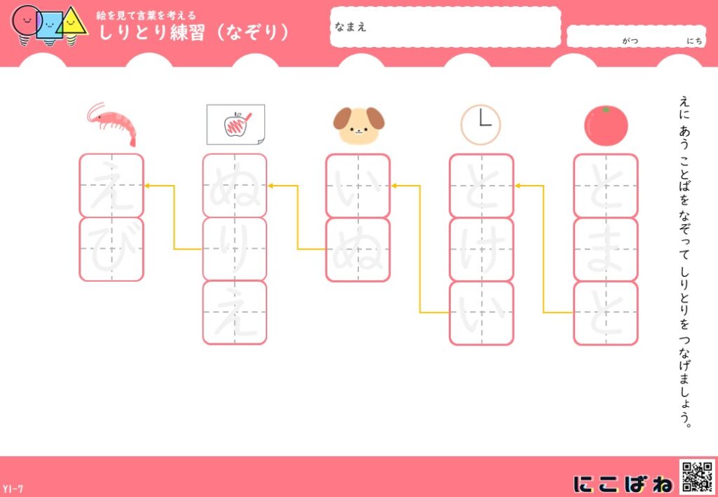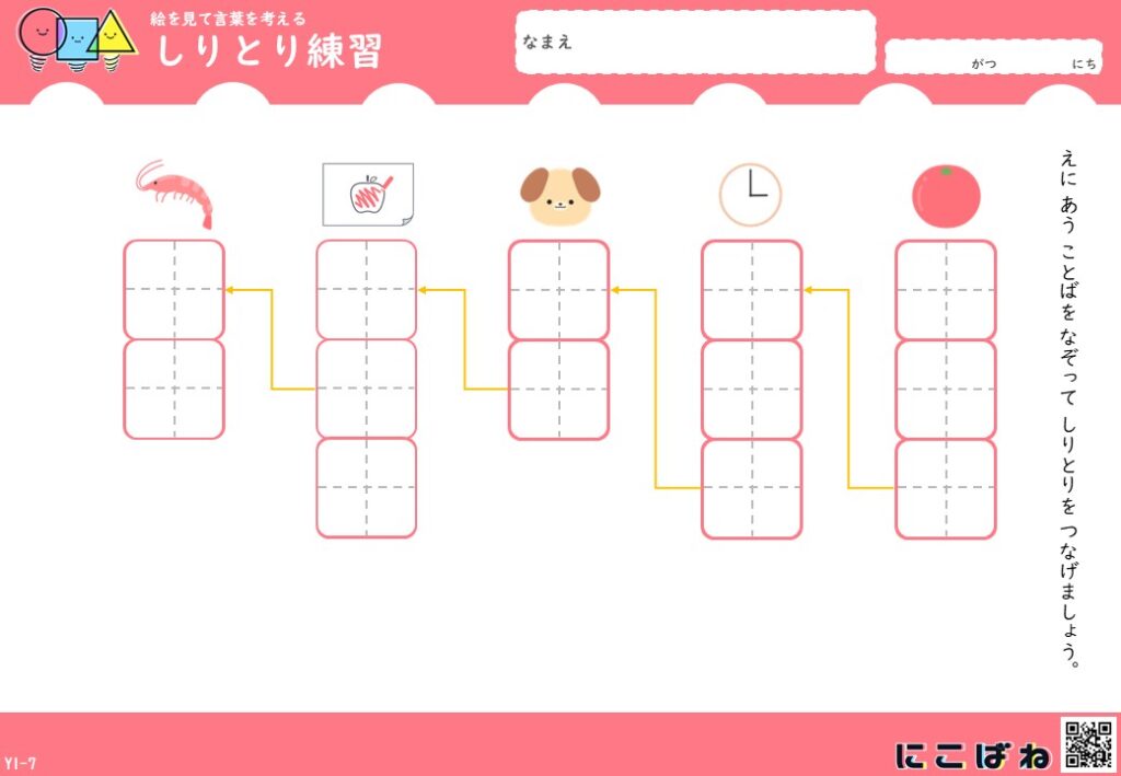 - 絵を見て言葉を考え、しりとりを完成させる練習プリントです。
