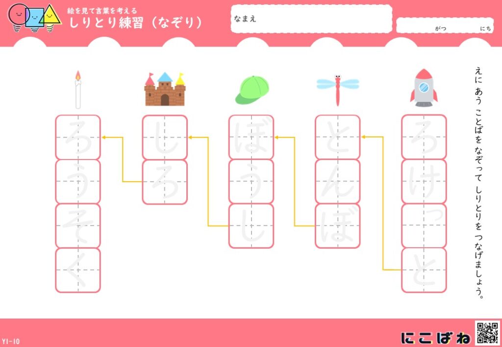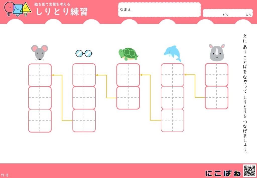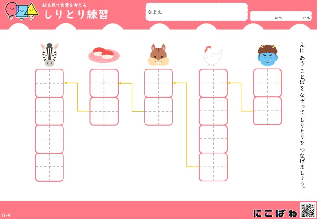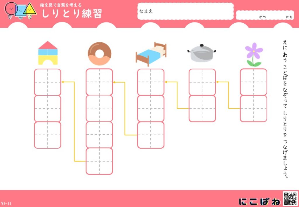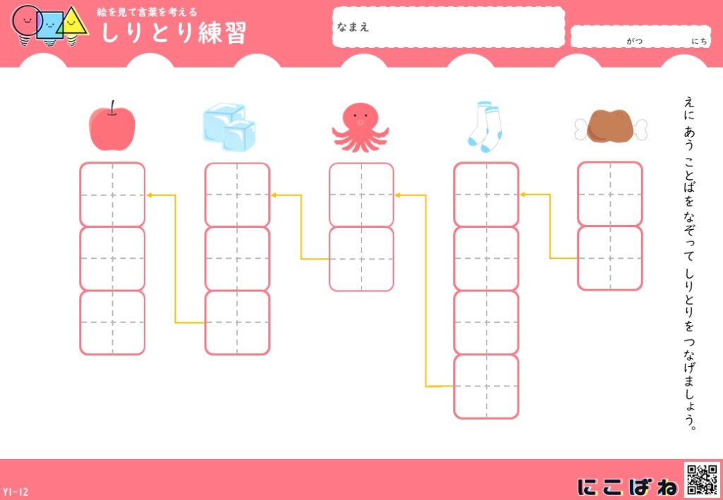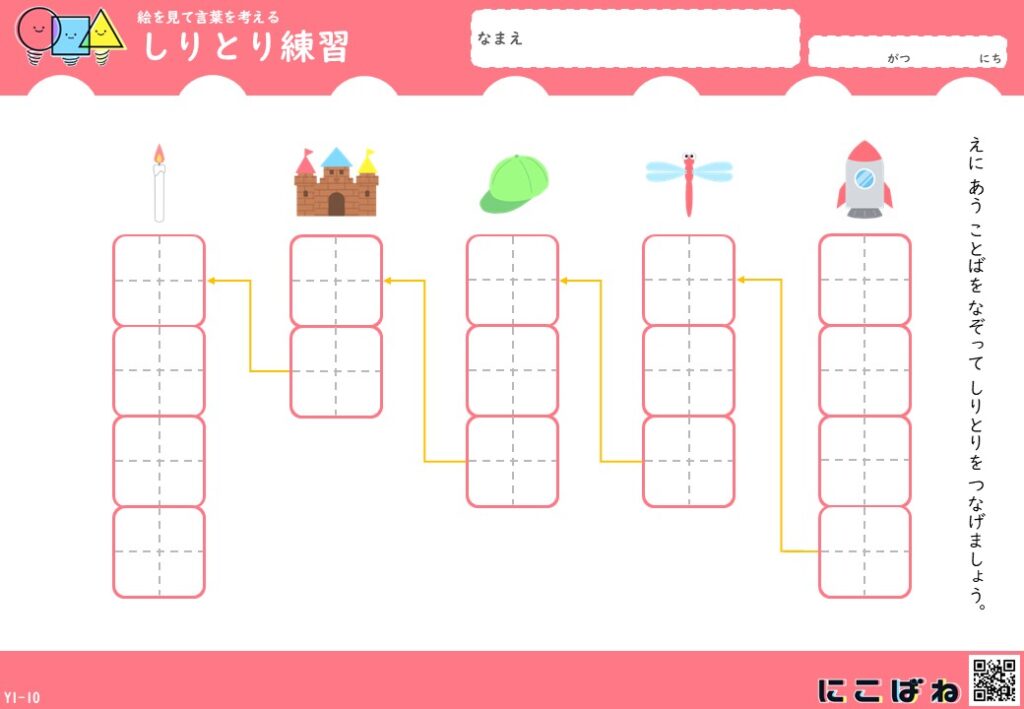 こちらは、絵を見て言葉を考えながら、しりとりの形で言葉をつなげる練習ができるプリントです。