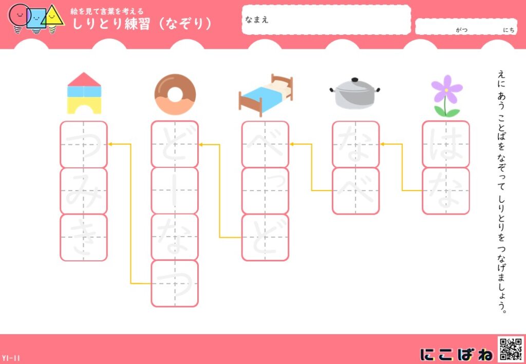 しりとりというなじみのある遊びを通して、言葉への関心や考える力をやさしく育てる一歩になればうれしいです。