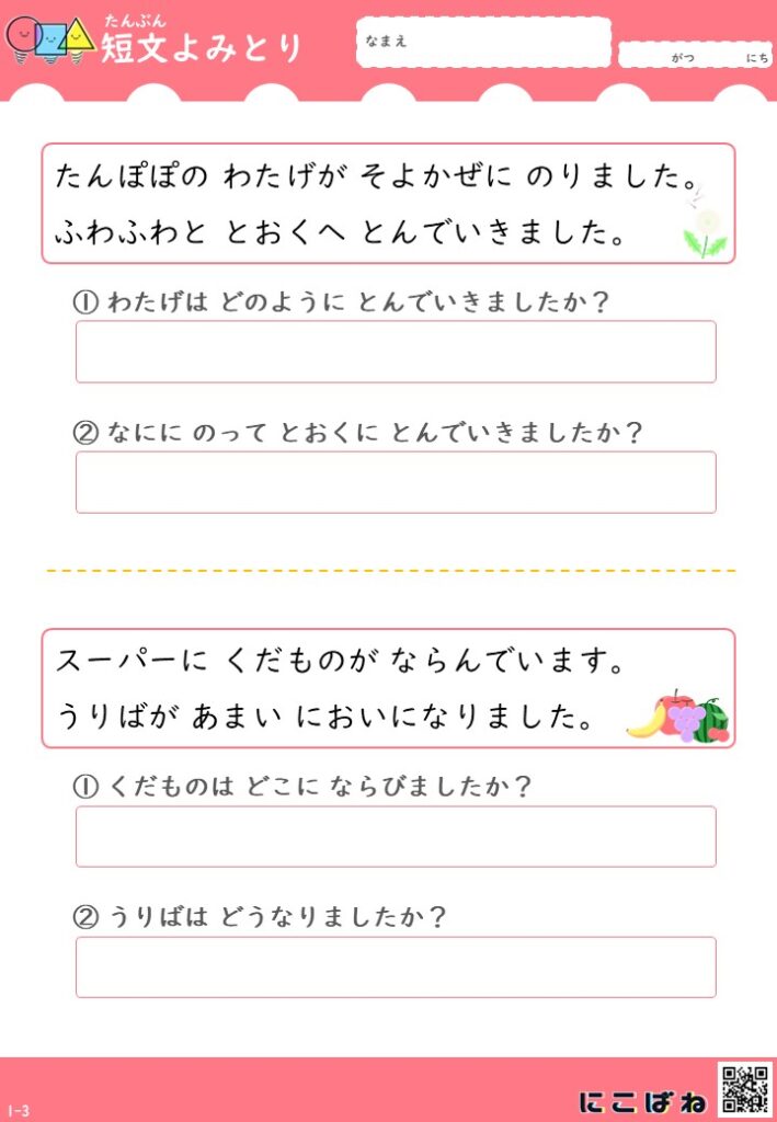 もう少し長めの文章にも挑戦してみたいときは、3文構成の短文よみとりプリントがおすすめです。