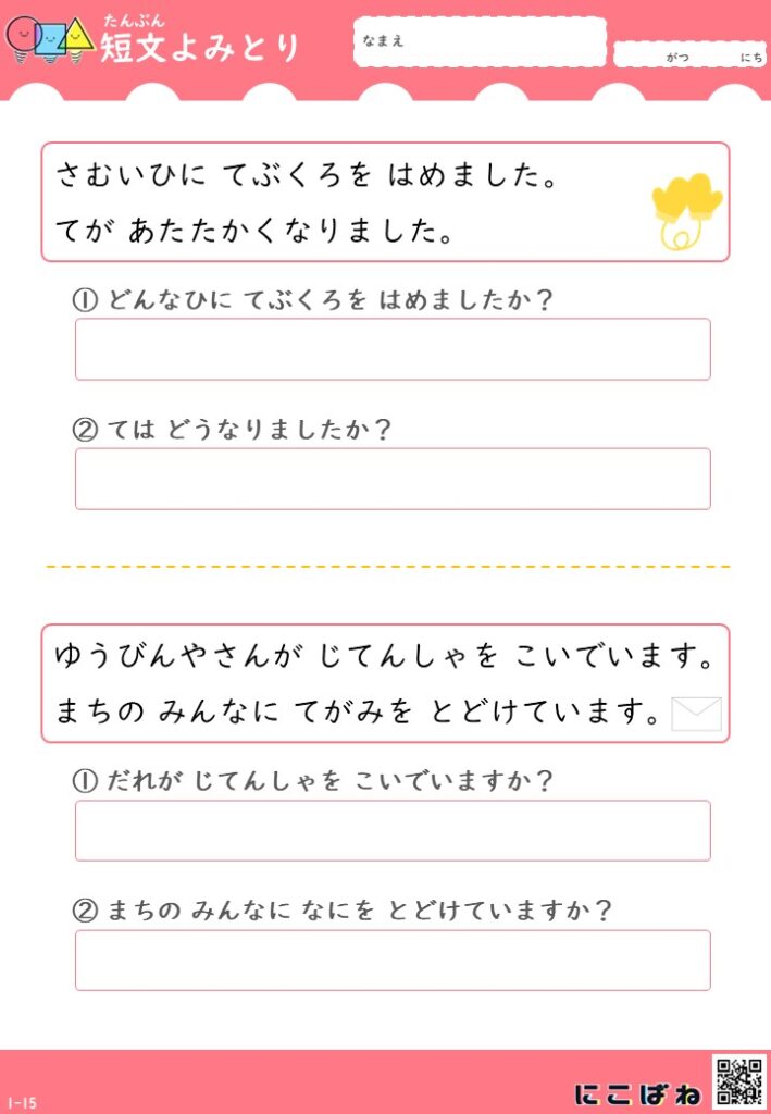 3文バージョンよりもさらにやさしい構成で、読解の導入や自信づくりにぴったりのプリントです。