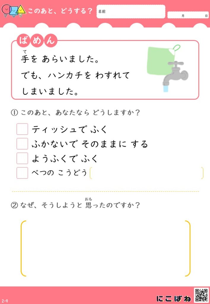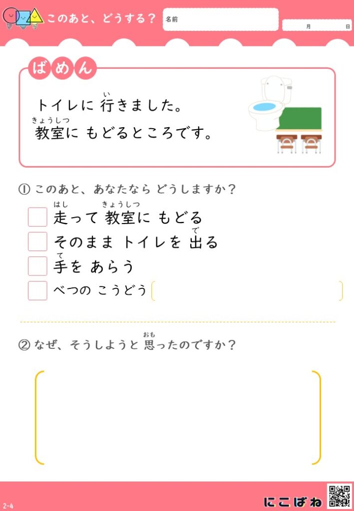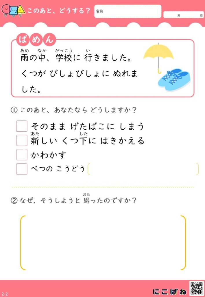 - 日常の場面文を読み、「このあとどうする?」を考える生活読解タイプのプリントです。