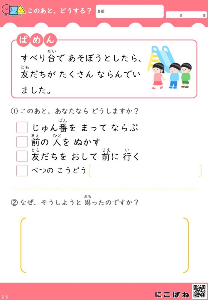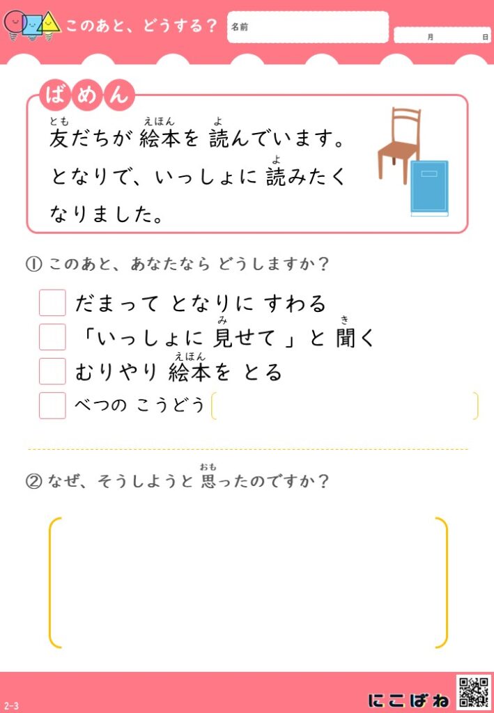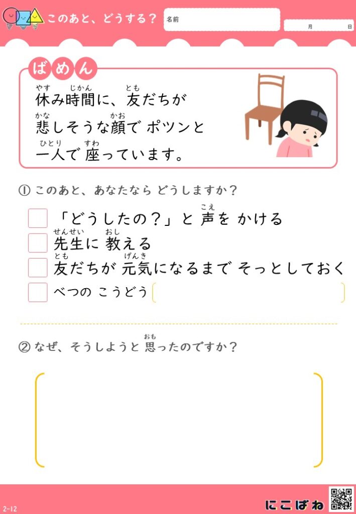 これまでのSST系プリントでは「気持ち」に注目する問題が中心でしたが、今回は一歩進めて、場面を読み取り、自分で行動を選ぶ力に焦点を当てました。