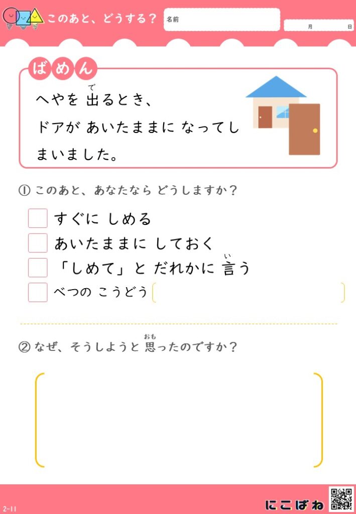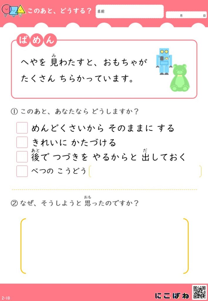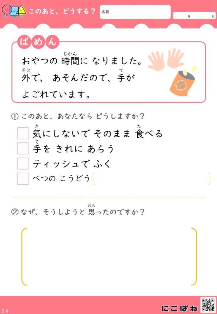 あえて迷いが生まれる選択肢を入れることで、生活場面の理解力・読解力・SST要素を同時に育てられるよう工夫しました。