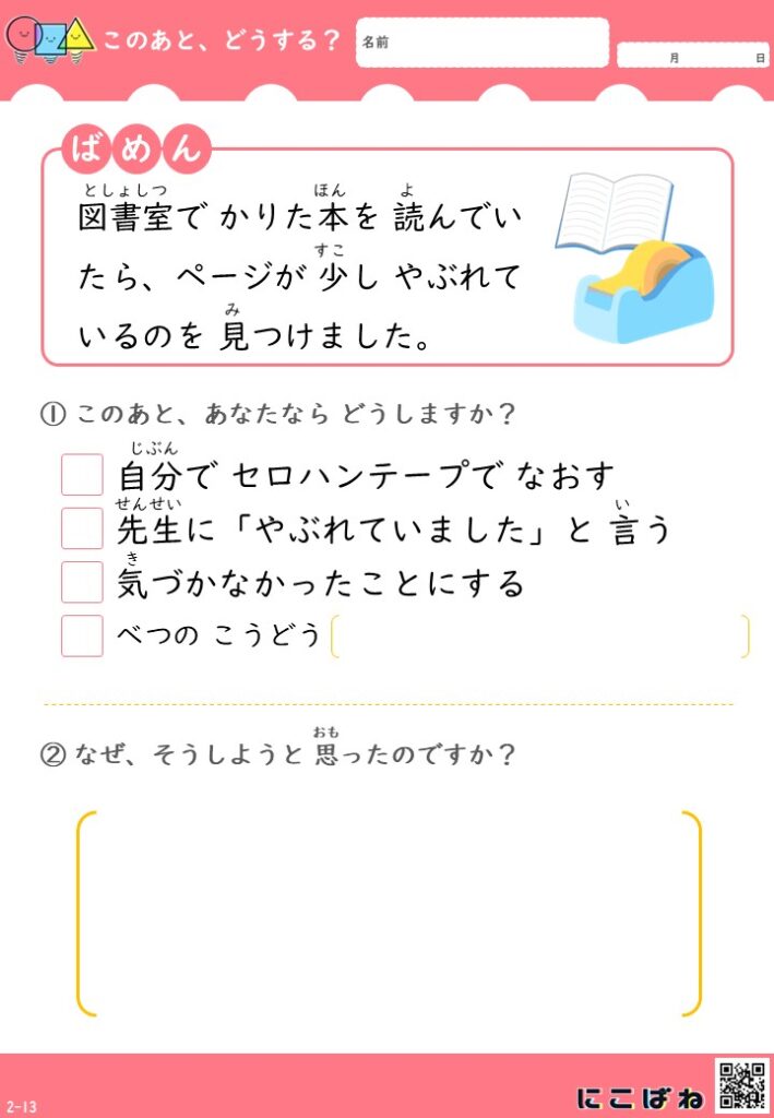 - 短い文章+選択式+理由記入の構成で、読む→選ぶ→考えを言葉にする流れを自然に体験できます。