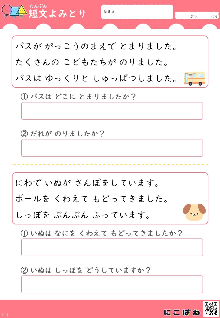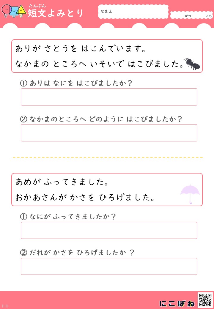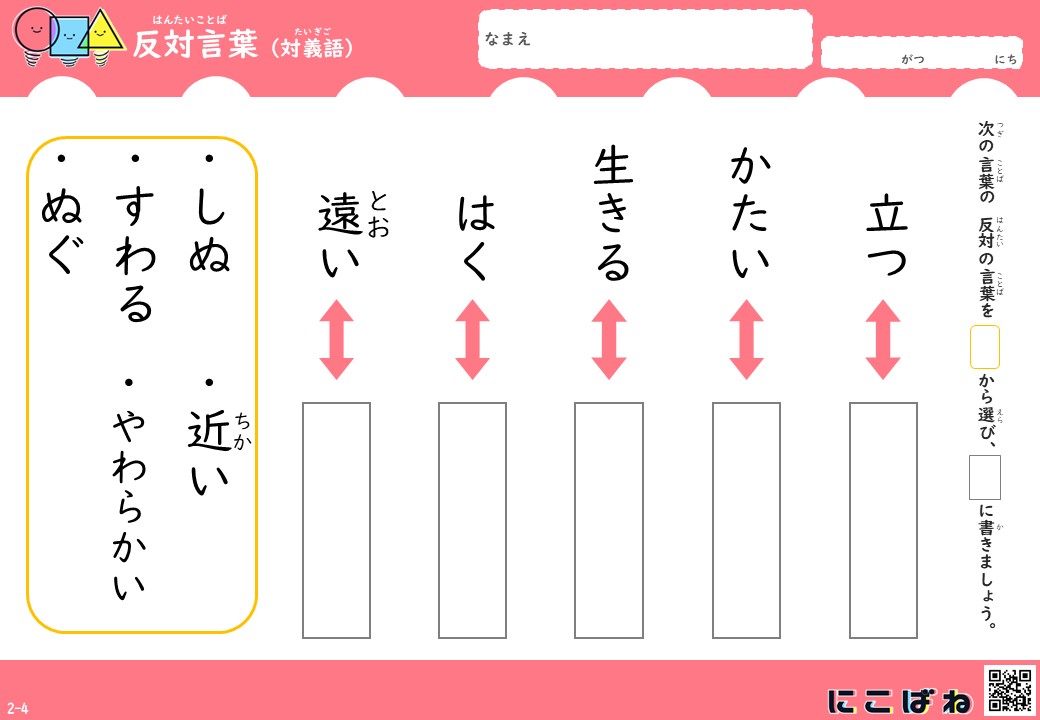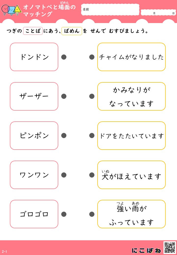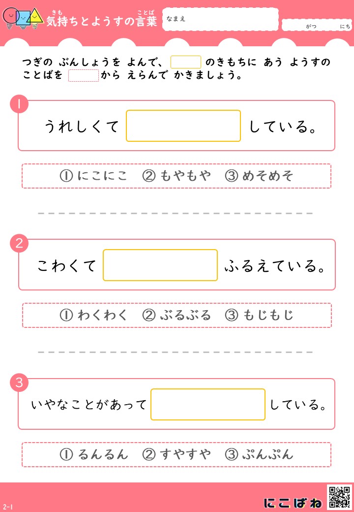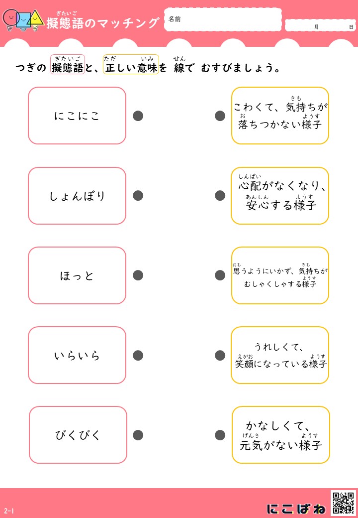 にこばねでは、学習ステップに沿いながら、言葉の面白さや表現する楽しさにふれられるプリントをご用意しています。