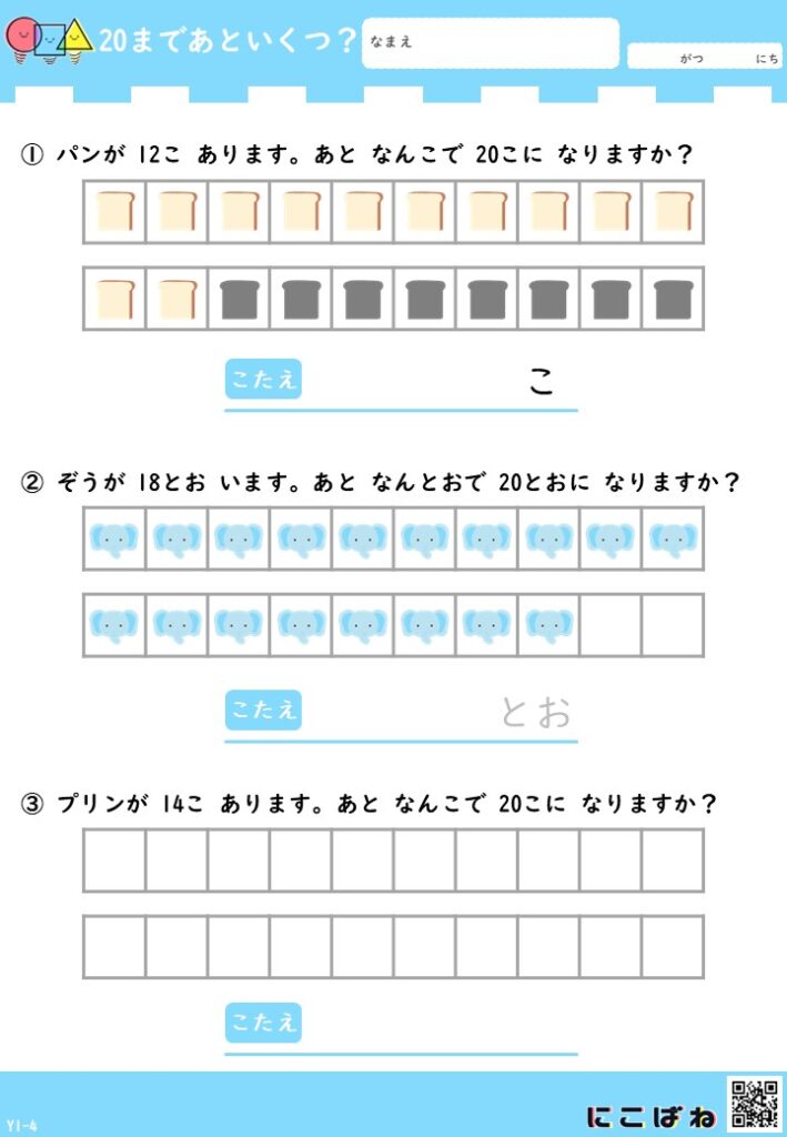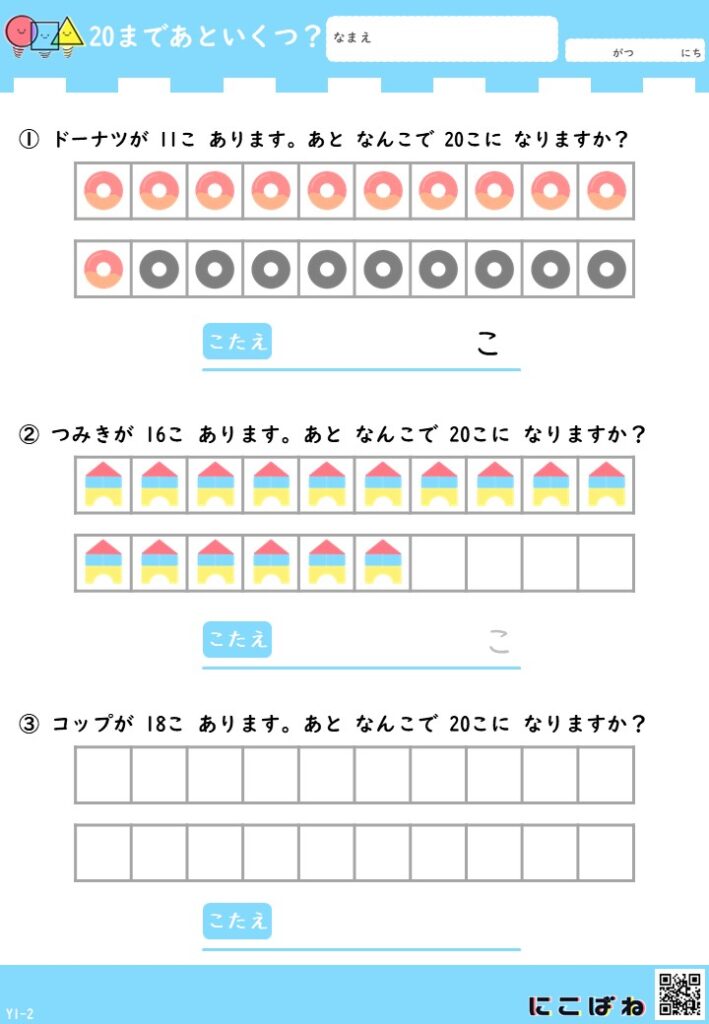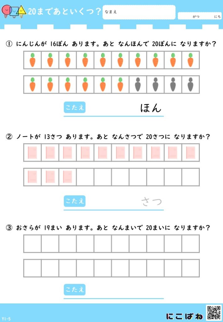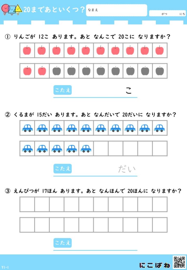 - 「あといくつ?」を考えて5・10・20のまとまりを作る算数プリントで、数の関係を楽しみながら理解できる内容です。