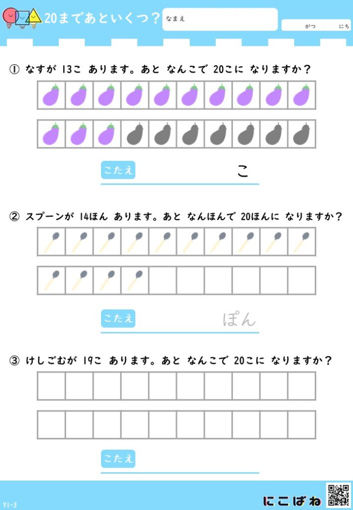 - 5・10・20のまとまりを意識しながら「あといくつ?」を考え、数の補い方と数の関係を自然に理解できるプリント