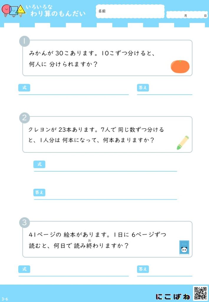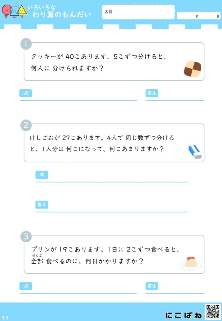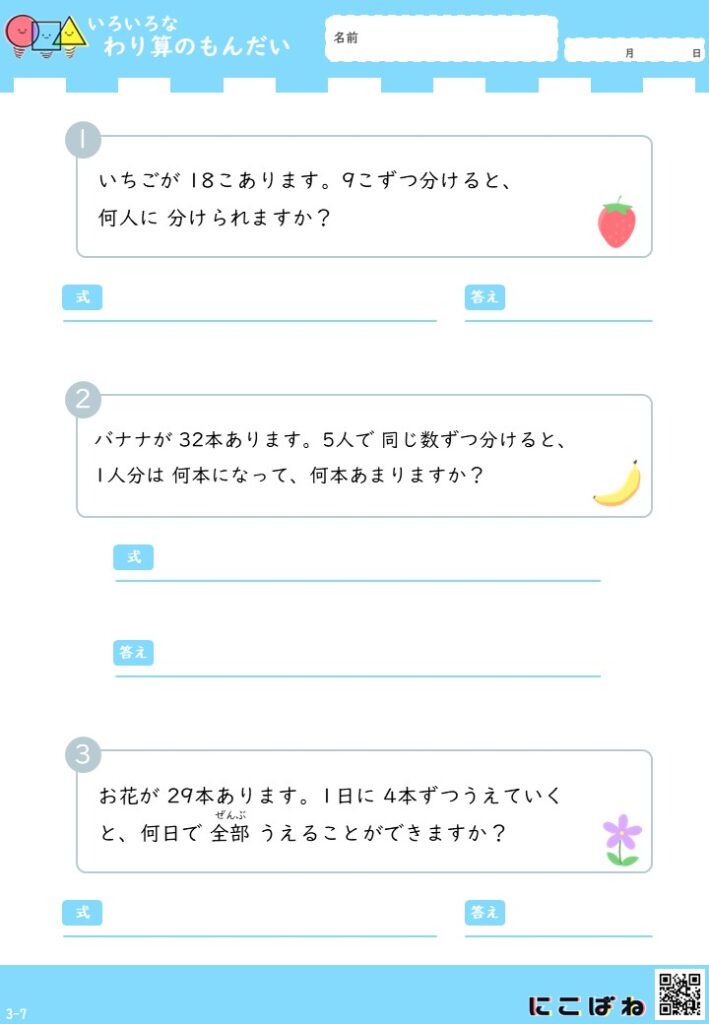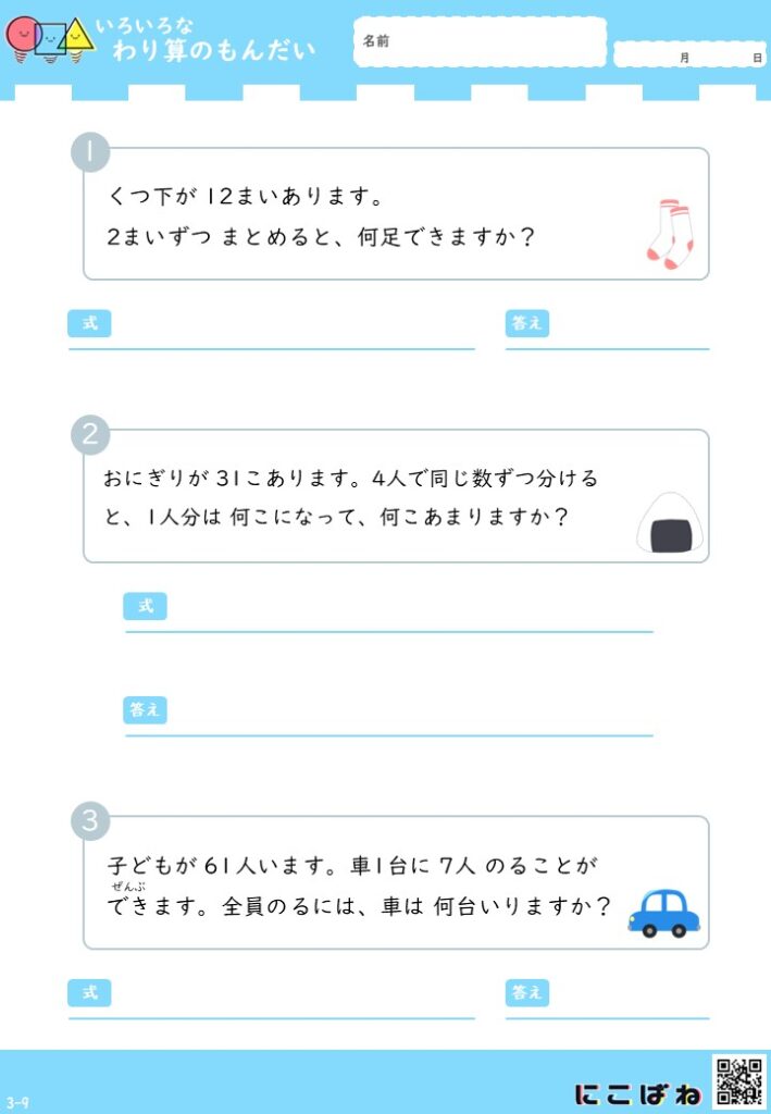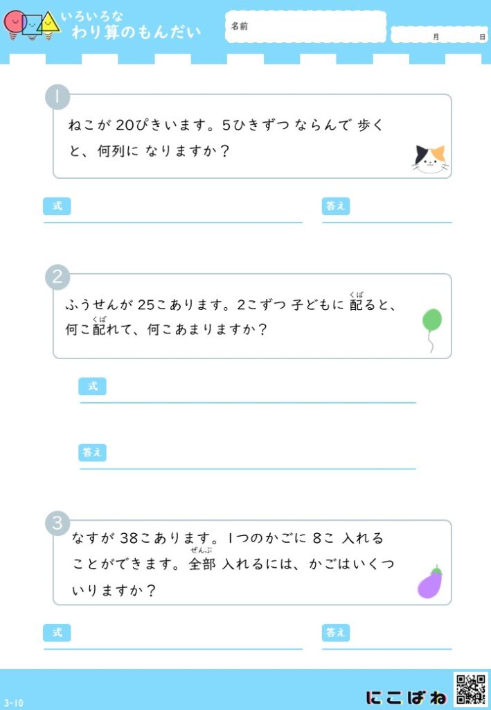 • 小学3年生向けのわり算文章題を1枚に3問収録しています。