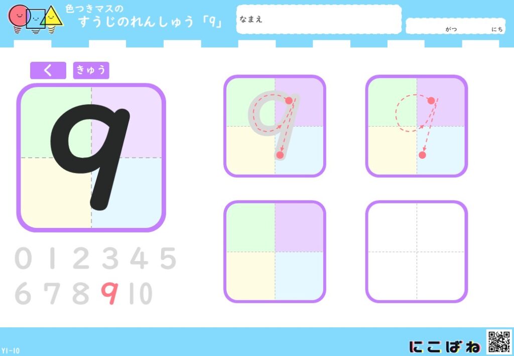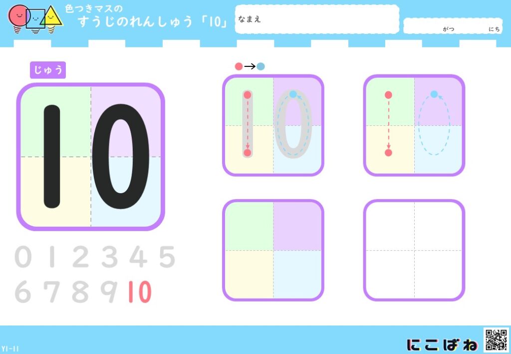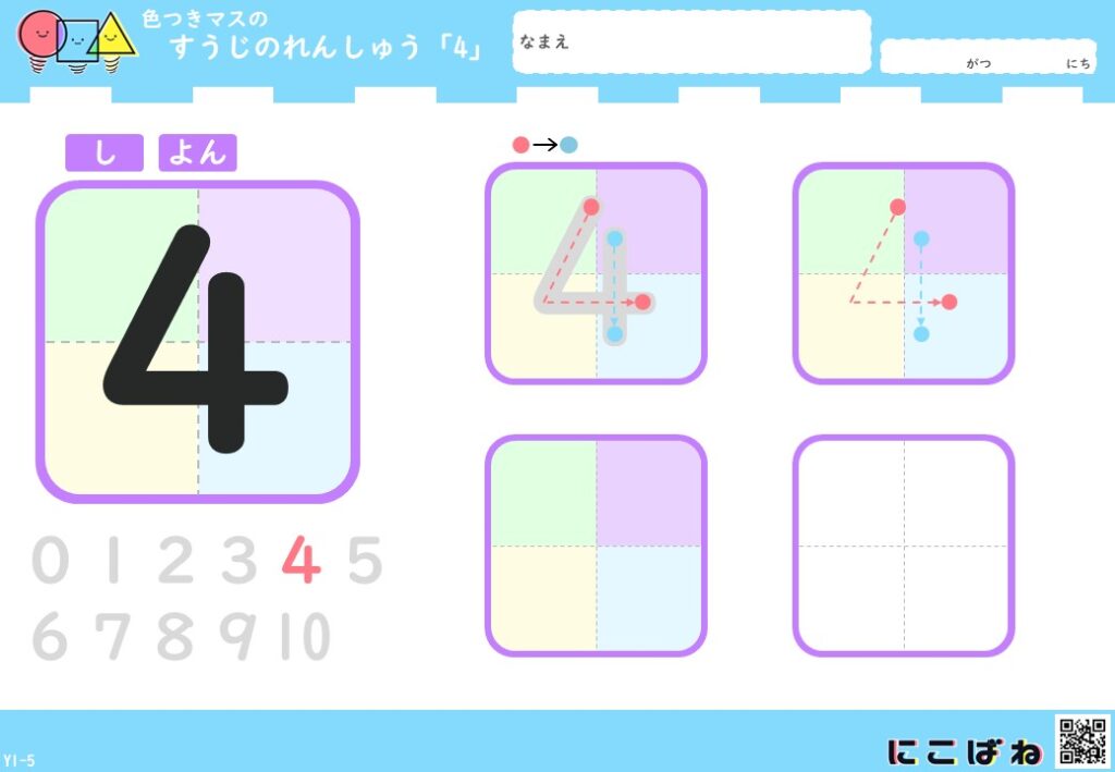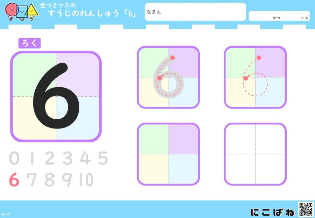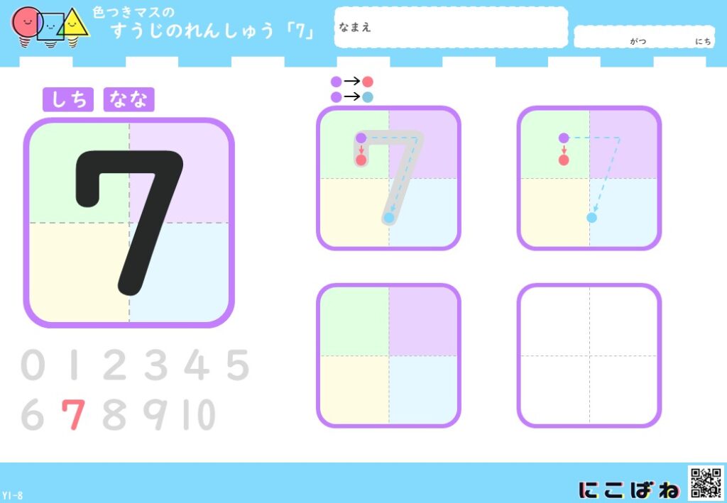 • 数字の正しい書き方と書く向きを、色つきマスを手がかりに自然と身につけることをねらいとしています。