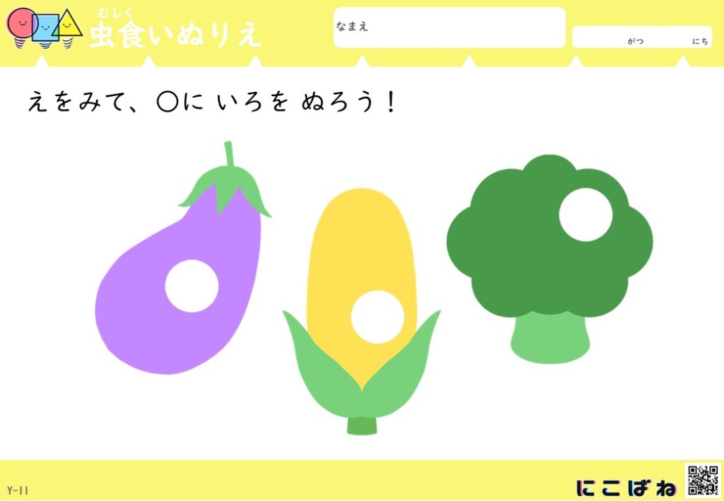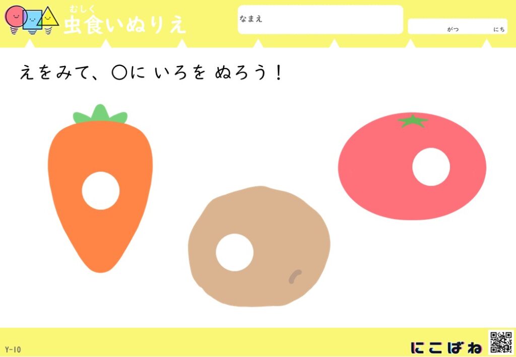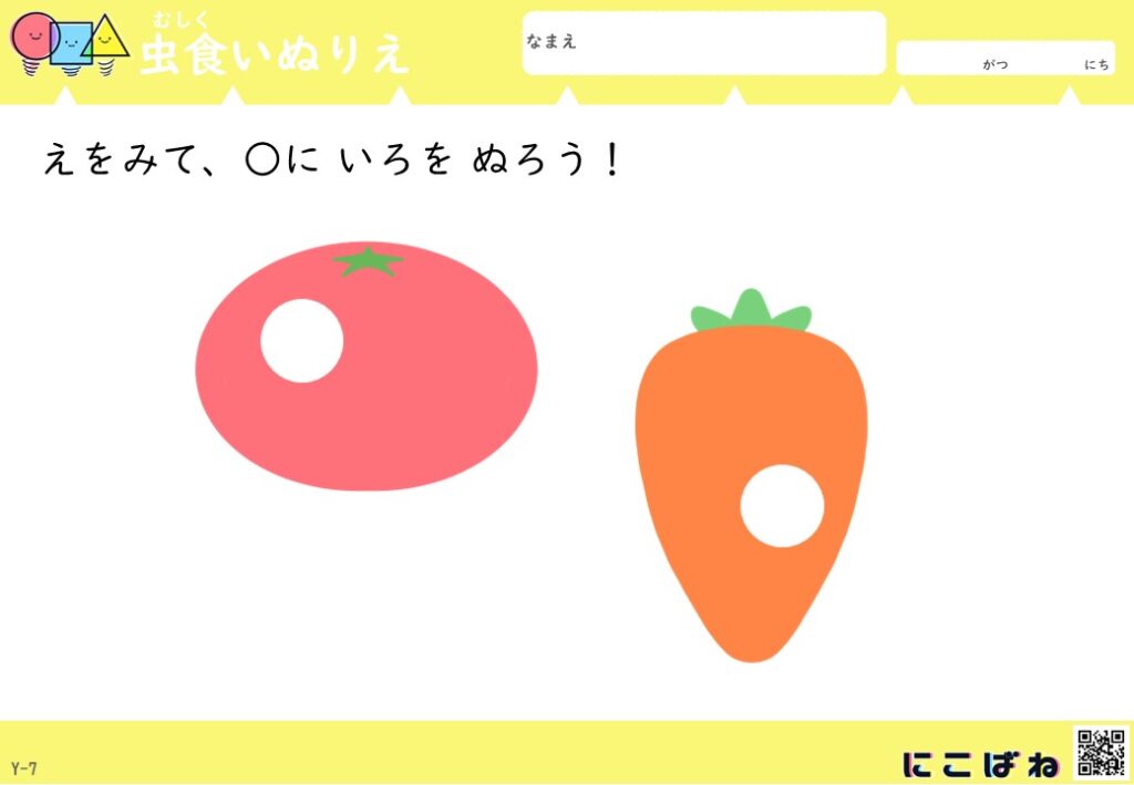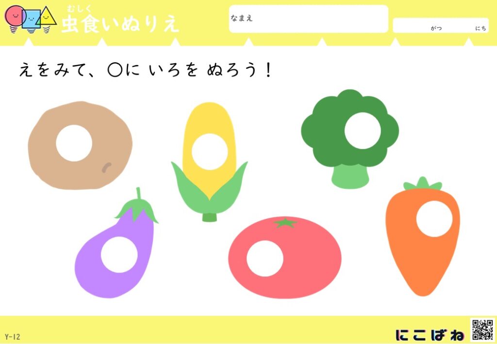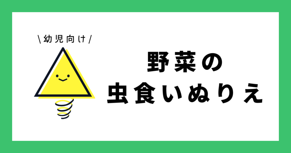 - 虫食いのあいた部分を手がかりに野菜を色を見分けてぬることで観察力と考える力を育てるぬりえプリント