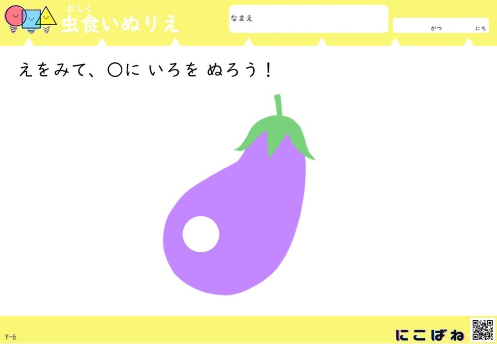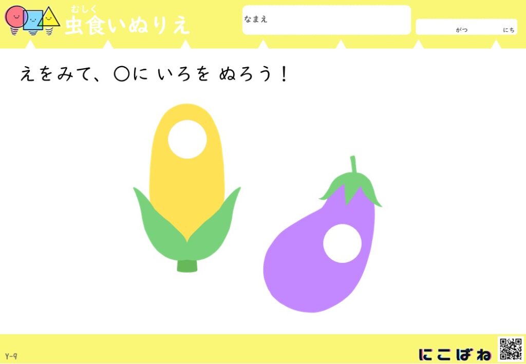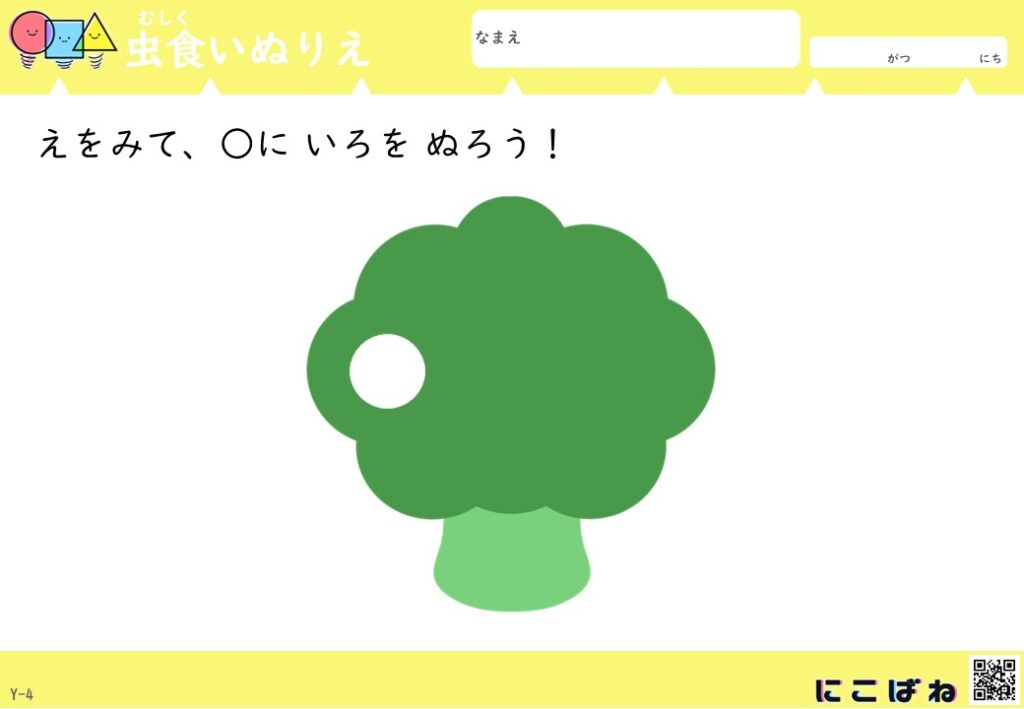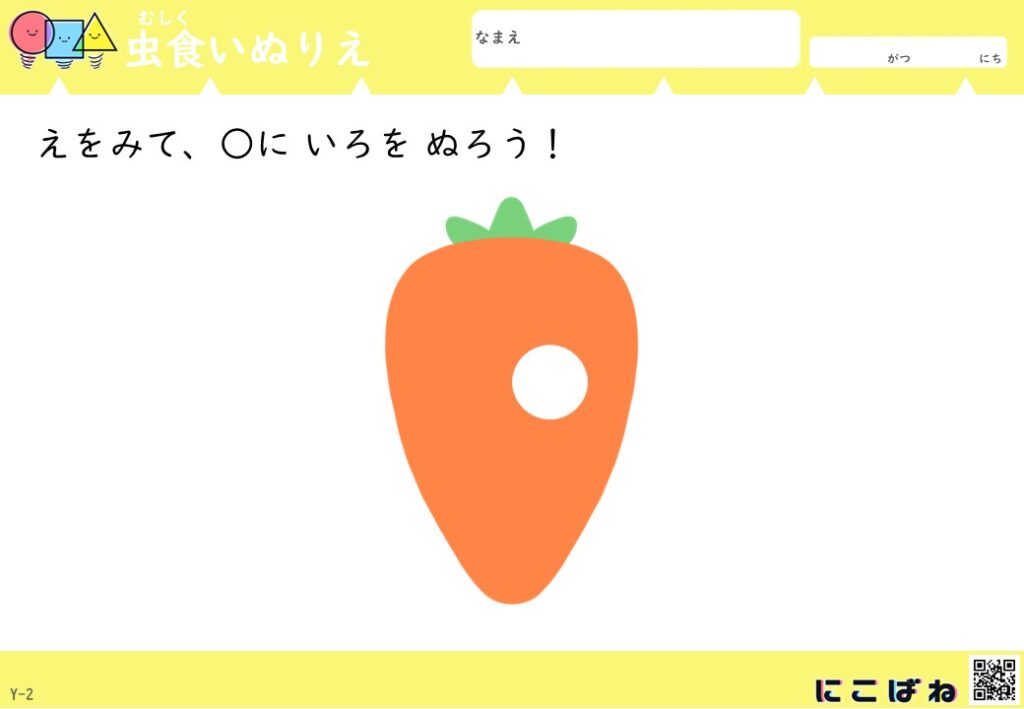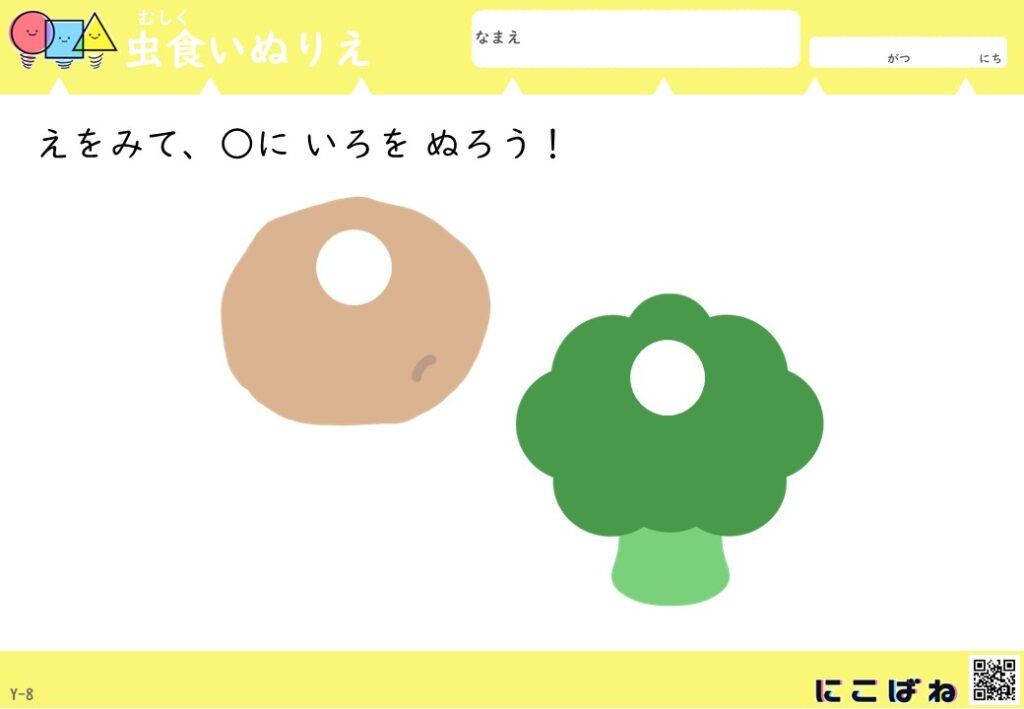 - 虫食いのあいた部分を手がかりに野菜を色を見分けてぬることで観察力と考える力を育てるぬりえプリント