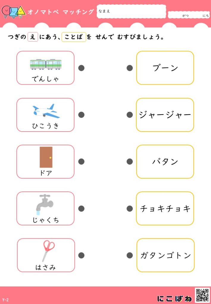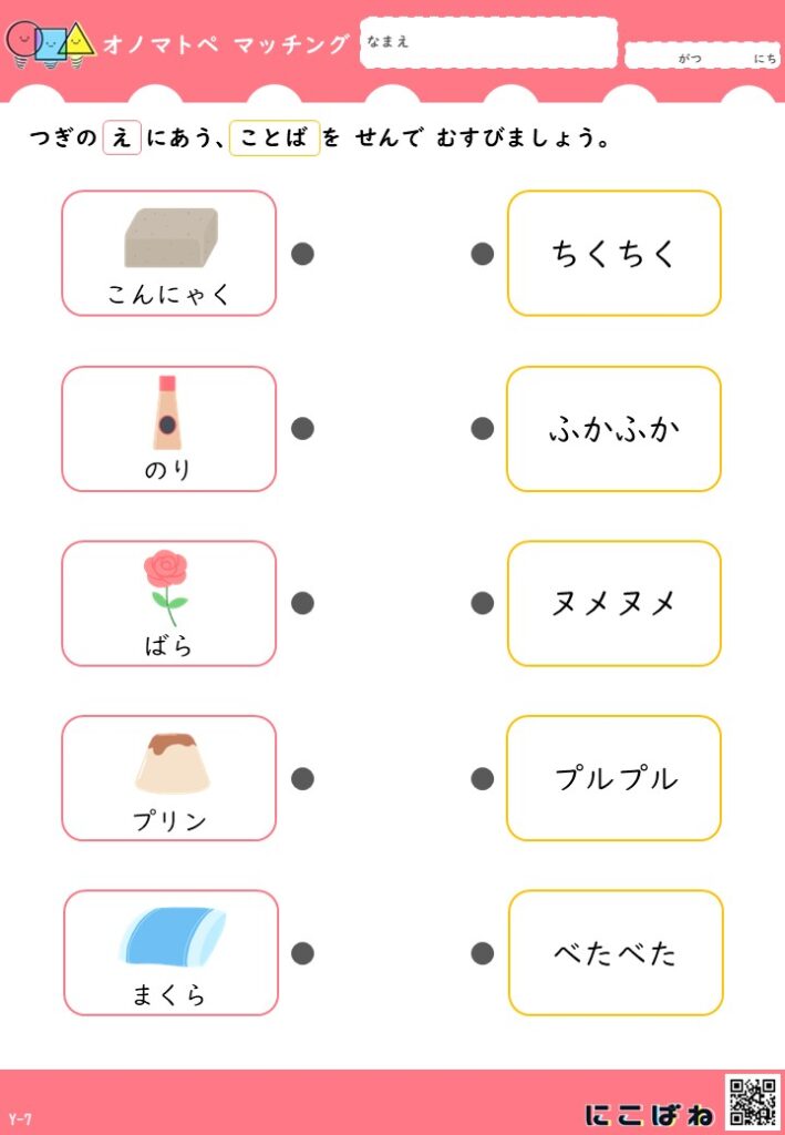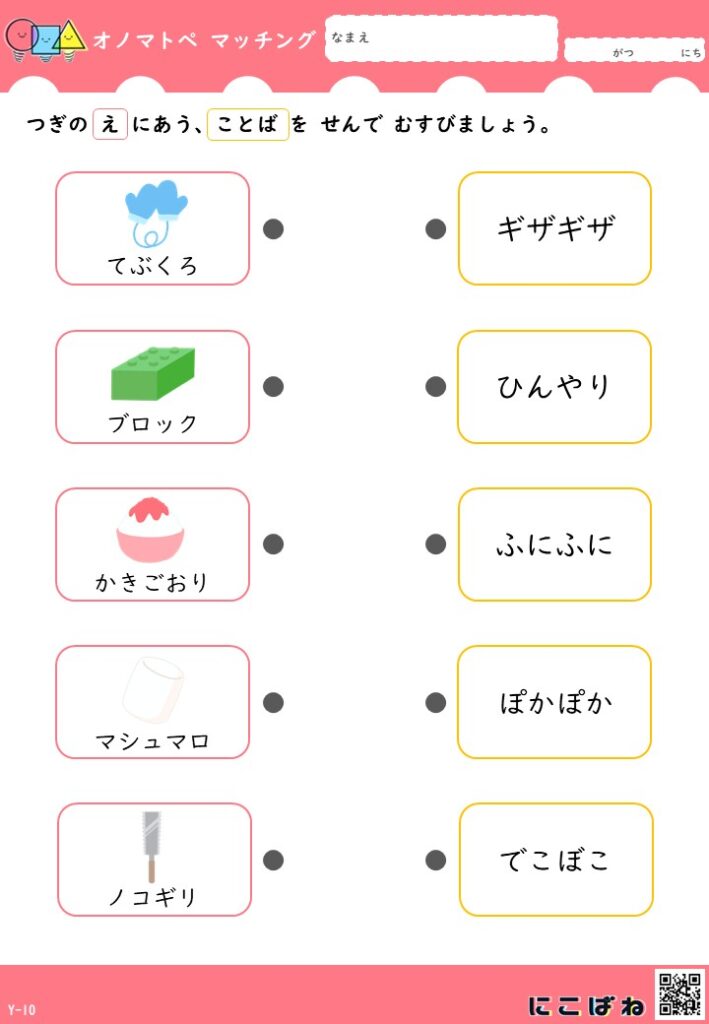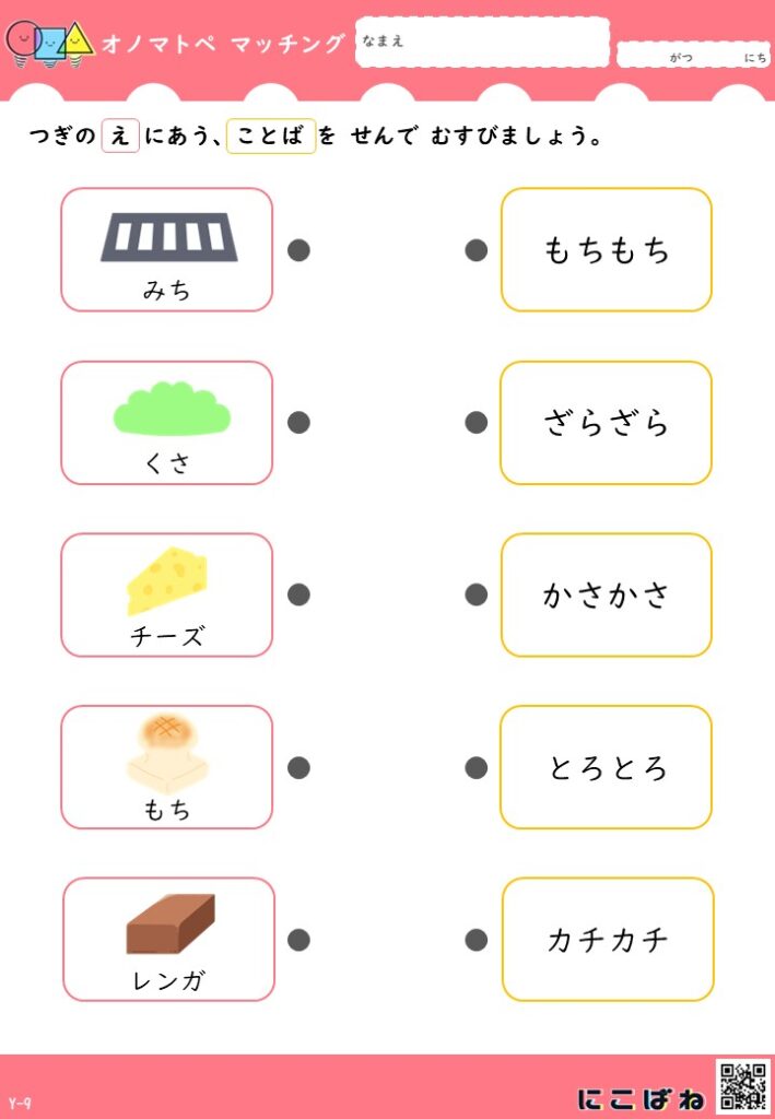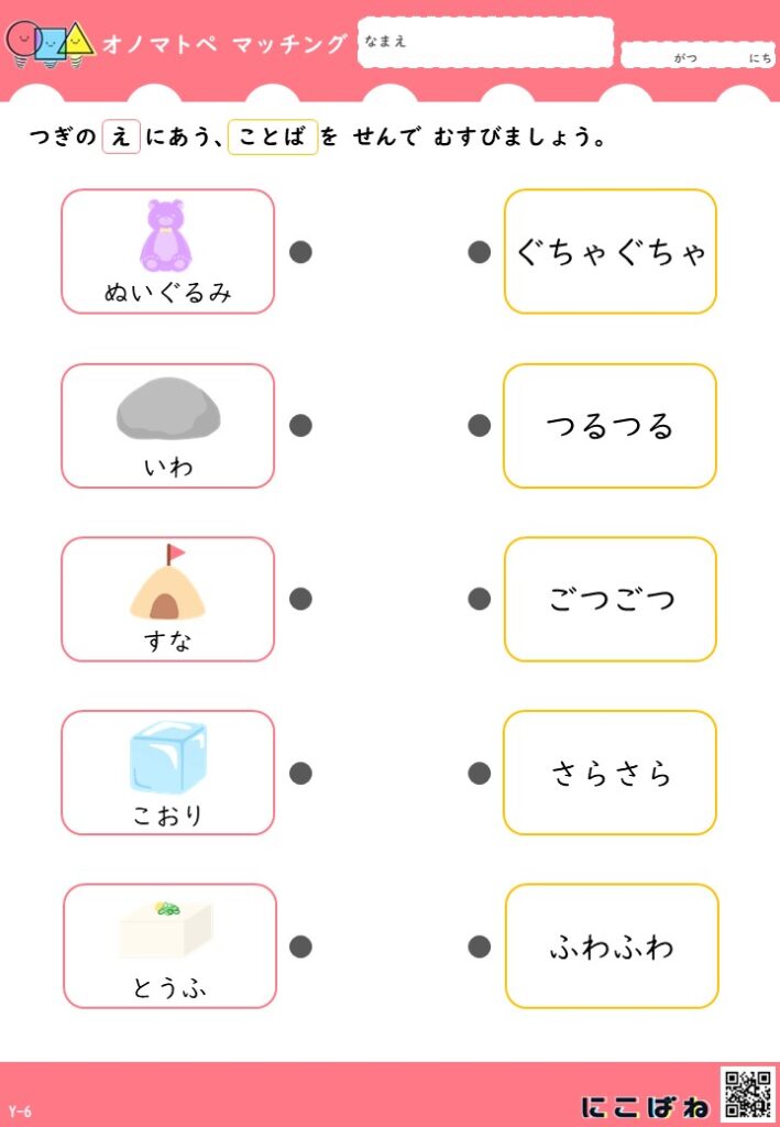 - 線で結ぶシンプルなレイアウトで、初めてのオノマトペ学習でも迷わず取り組める設計にしています。