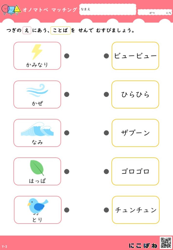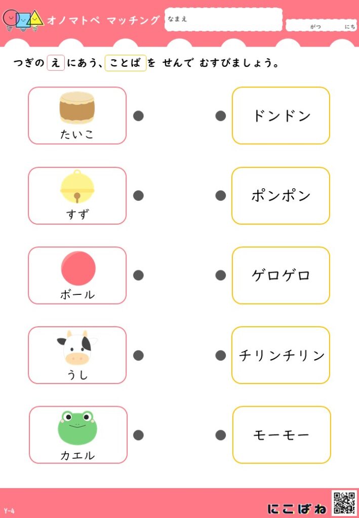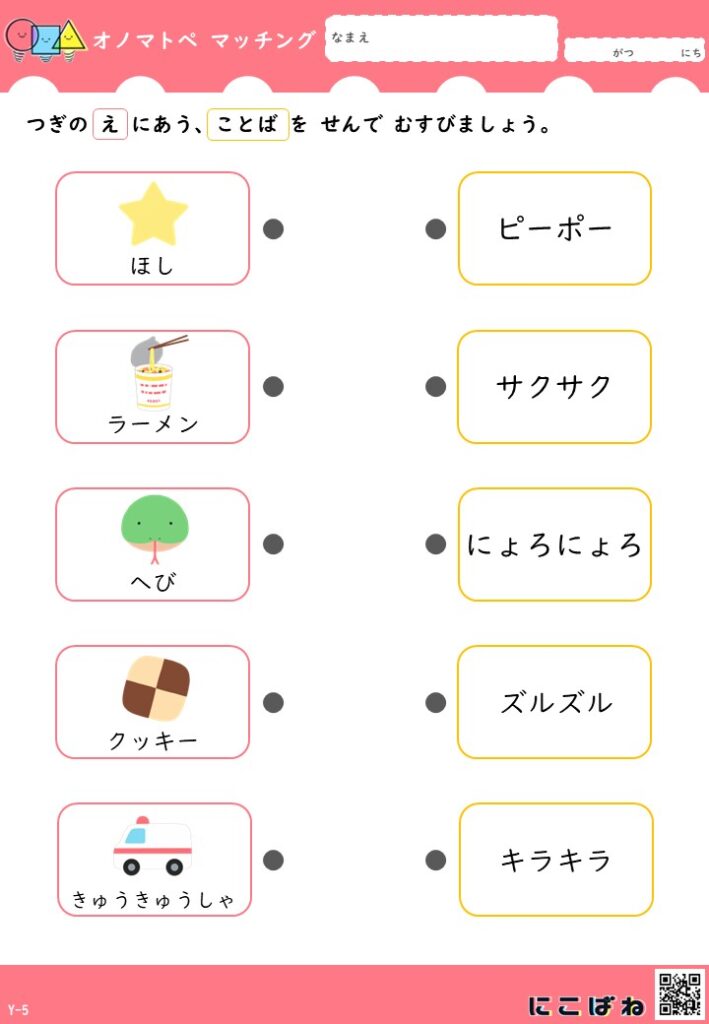 - 幼児向けの国語プリントとして、オノマトペ・語彙・マッチング学習をまとめて体験できる教材です。
